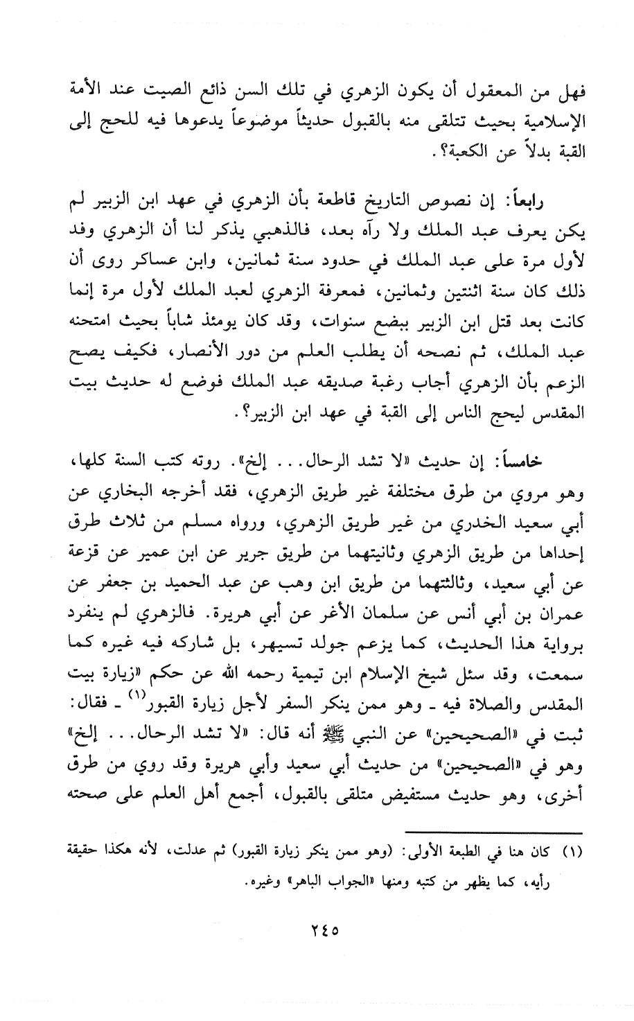 خامساً: إن حديث: «لاَ تُشَدُّ الرِّحَالُ ... الخ» روته كُتُبُ السُنَّةِ كلها، وهو مروي من طرق مختلفة عن طريق الزُّهْرِي، فقد أخرجه " البخاري " عن أبي سعيد الخُدري من غير طريق الزُّهْرِي، ورواه " مسلم " من ثلاث طرق إحداهما من طريق الزُّهْرِي وثانيتهما من طريق جرير عن ابن عمير عن قزعة عن أبي سعيد، وثالثتهما من طريق ابن وهب عن عبد الحميد بن جعفر عن عمران بن أبي أنس عن سلمان الأغر عن أبي هريرة. فالزُّهْرِي لم ينفرد برواية هذا الحديث، كما يزعم جولدتسيهر، بل شاركه فيه غيره كما سمعت، وقد سئل شيخ الإسلام ابن تيمية - رَحِمَهُ اللهُ - عن حكم زيارة بيت المقدس والصلاة فيه - وهو مِمَّنْ ينكر السفر لأجل زيارة القبور (¬1) فقال: ثبت في " الصَحِيحَيْنِ " عَنْ النَّبِيِّ - صَلََّى اللهُ عَلَيْهِ وَسَلَّمَ - أنه قال: «لاَ تُشَدُّ الرِّحَالُ ... الخ» وهو في " الصَحِيحَيْنِ " من حديث أبي سعيد وأبي هريرة وقد رُوِيَ من طرق أخرى، وهو حديث مستفيض متلقى بالقبول، أجمع أهل العلم على صحته