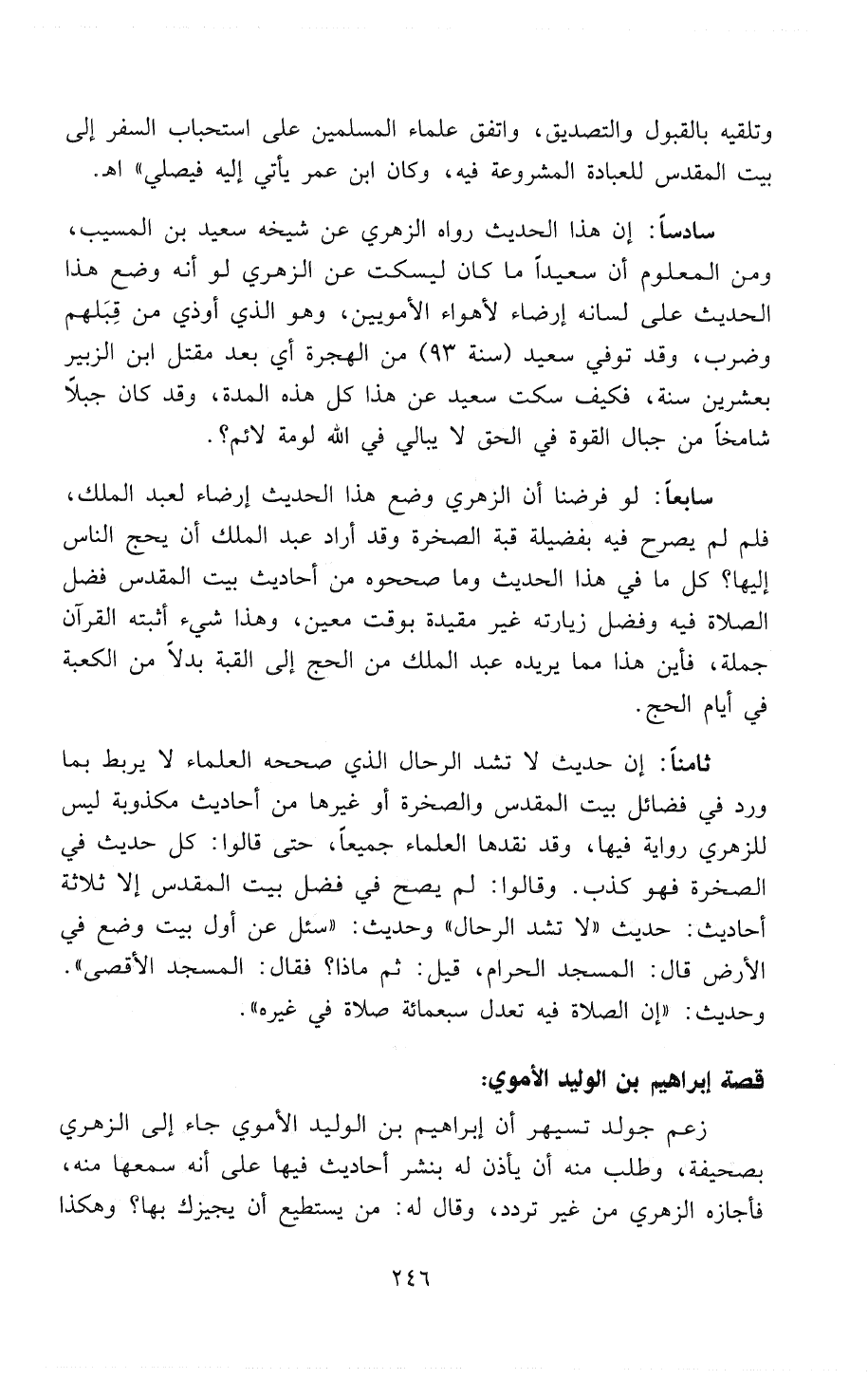 سَابِعاًً: لو فرضنا أَنَّ الزُّهْرِي وضع هذا الحديث إرضاء لعبد الملك، فلِمِ لَمْ يُصَرِّحْ فيه بفضيلة قبة الصخرة وقد أراد عبد الملك أن يحج الناس إليها؟ كل ما في هذا الحديث وما صَحَّحُوهُ من أحاديث بيت المقدس فضل الصلاة فيه وفضل زيارته غير مقيدة بوقت معين، وهذا شيء أثبته القرآن جملة، فأين هذا مِمَّا يريده عبد الملك من الحج إلى القبة بدلاً من الكعبة في أيام الحج.