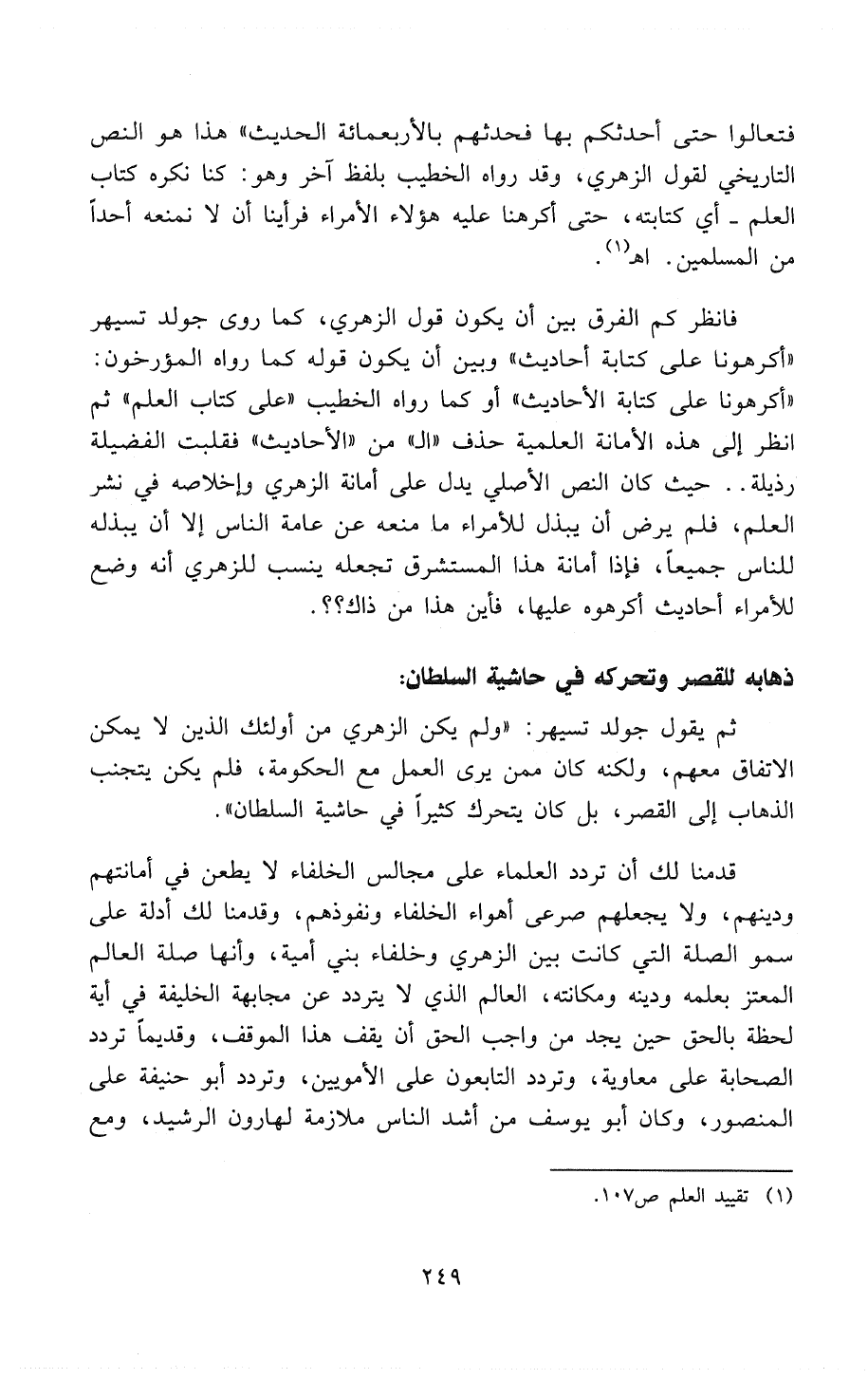 فانظر كم الفرق بين أن يكون قول الزُّهْرِيِّ كما روى جولدتسيهر: «أَكْرَهُونَا عَلَى كِتَابَةِ أَحَادِيثَ» وبين أن يكون قوله كَمَا رَوَاهُ المُؤَرِّخُونَ: «أَكْرَهُونَا عَلَى كِتَابَةِ الأَحَادِيثِ» أو كما رواه الخطيب «عَلَى كِتَابَةِ العِلْمِ» ثم انظر إلي هذه الأمانة العلمية حذف «الـ» من «الأحاديث» فقلبت الفضيلة رذيلة .. حيث كان النص الأصلي يدل على أمانة الزُّهْرِي وإخلاصه في نشر العلم، فلم يرض أن يبذل للأمراء ما منعه عن عامة الناس إلا أن يبذله للناس جميعاً، فإذا أمانة هذا المستشرق تجعله ينسب للزهري أنه وضع للأمراء أحاديث أكرهوه عليها، فأين هذا من ذاك؟؟.