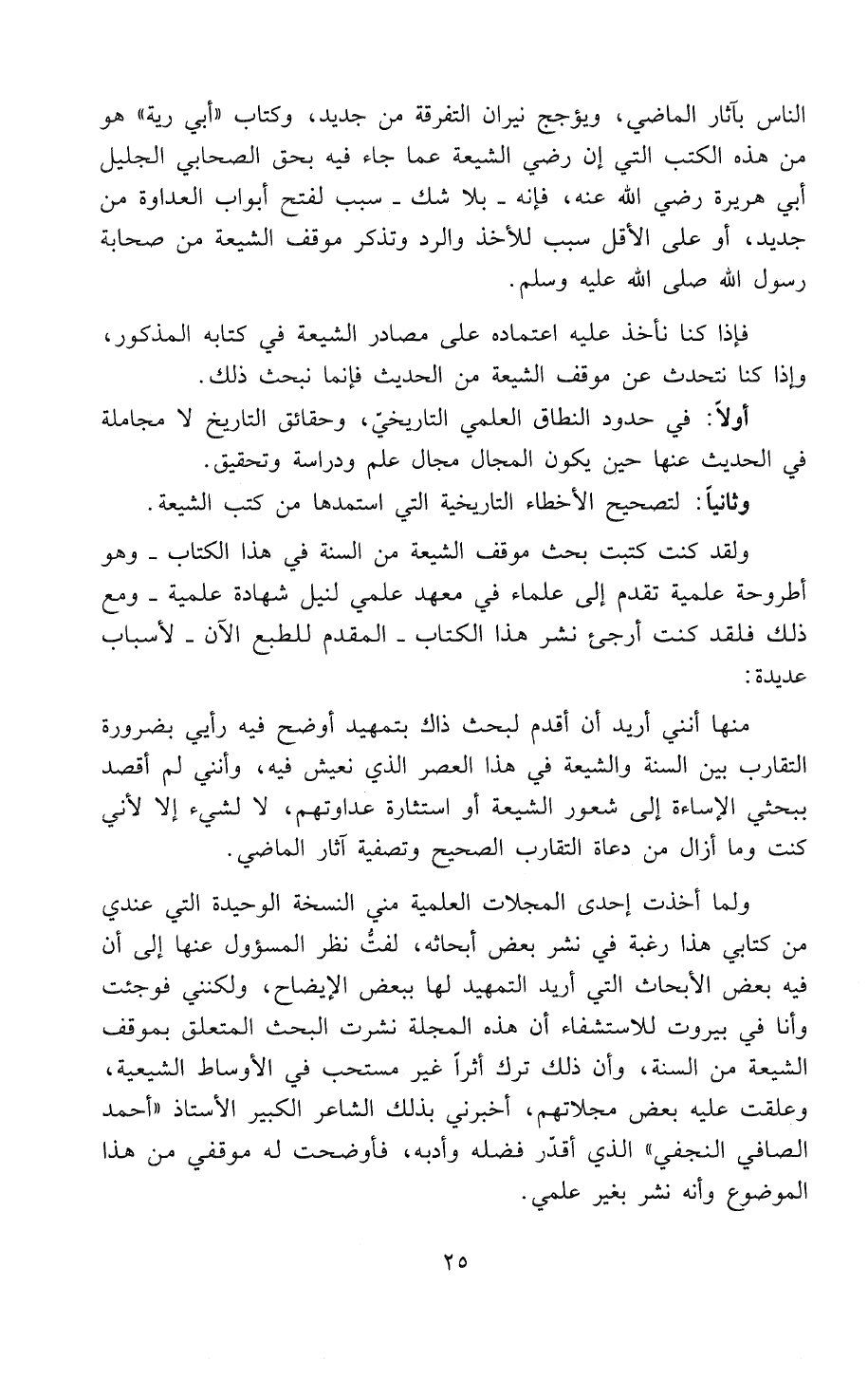 الناس بآثار الماضي، ويؤجج نيران التفرقة من جديد، وكتاب «أبي رية» هو من هذه الكتب التي إن رضي الشِيعَة عما جاء فيه بحق الصحابي الجليل أبي هريرة - رَضِيَ اللهُ عَنْهُ -، فإنه - بلا شك - سبب لفتح أبواب العداوة من جديد، أو على الأقل سبب للأخذ والرد وتذكر موقف الشِيعَة من صحابة رسول الله - صَلََّى اللهُ عَلَيْهِ وَسَلَّمَ -.