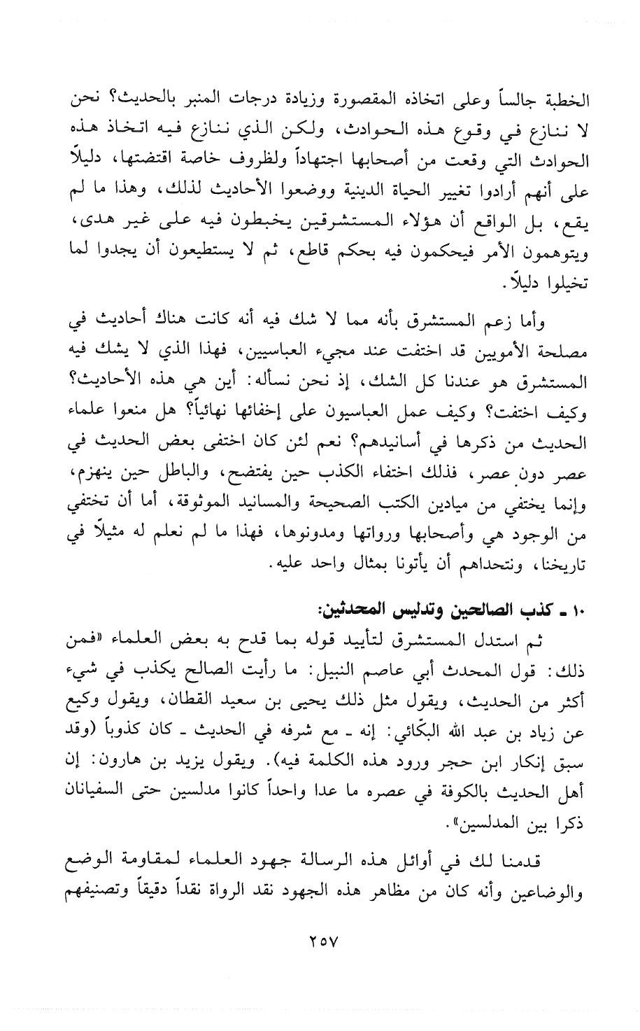وأما زعم المستشرق بأنه مِمَّا لا شك فيه أنه كانت هناك أحاديث في مصلحة الأُمَوِيِّينَ قد اختفت عند مجيء العباسيين، فهذا الذي لا يشك فيه المستشرق هو عندنا كل الشك، إذ نحن نسأله: أين هي هذه الأحاديث؟ وكيف اختفت؟ وكيف عمل العباسيون على إخفائها نهائياً؟ هل منعوا علماء الحديث من ذكرها في أسانيدهم؟ نعم لئن كان اختفى بعض الحديث في عصر دُونَ عصر فذلك اختفاء الكذب حين يفتضح، والباطل حين ينهزم، وانما يختفي من ميادين الكتب الصحيحة والمسانيد الموثوقة، أما أن تختفي من الوجود هي وأصحابها وَرُوَّاتِهَا ومُدَوِّنُوها، فهذا ما لم نعلم له مثيلاً في تاريخنا، وَنَتَحَدَّاهُمْ أن يأتونا بمثال واحد عليه.