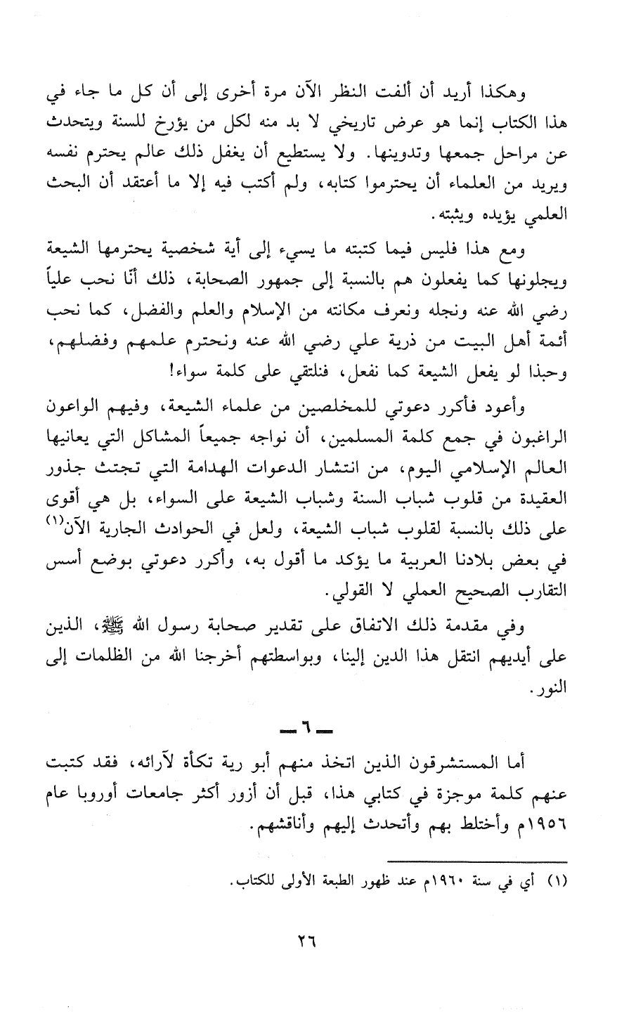 وأعود فأكرر دعوتي للمخلصين من علماء الشِيعَةِ، وفيهم الوَاعُونَ الراغبون في جمع كملة المُسْلِمِينَ، أن نواجه جميعاً المشاكل التي يعانيها العالم الإسلامي اليوم، من انتشار الدعوات الهدامة التي تجتث جذور العقيدة في قلوب شباب السُنَّةِ وشباب الشِيعَةِ على السواء، بل هي أقوى على ذلك بالنسبة لقلوب شباب الشِيعَةِ، ولعل في الحوادث الجارية الآن (¬1) في بعض بلادنا العربية ما يؤكد ما أقول به، وأكرر دعوتي بوضع أسس التقارب الصحيح العملي لا القولي.
