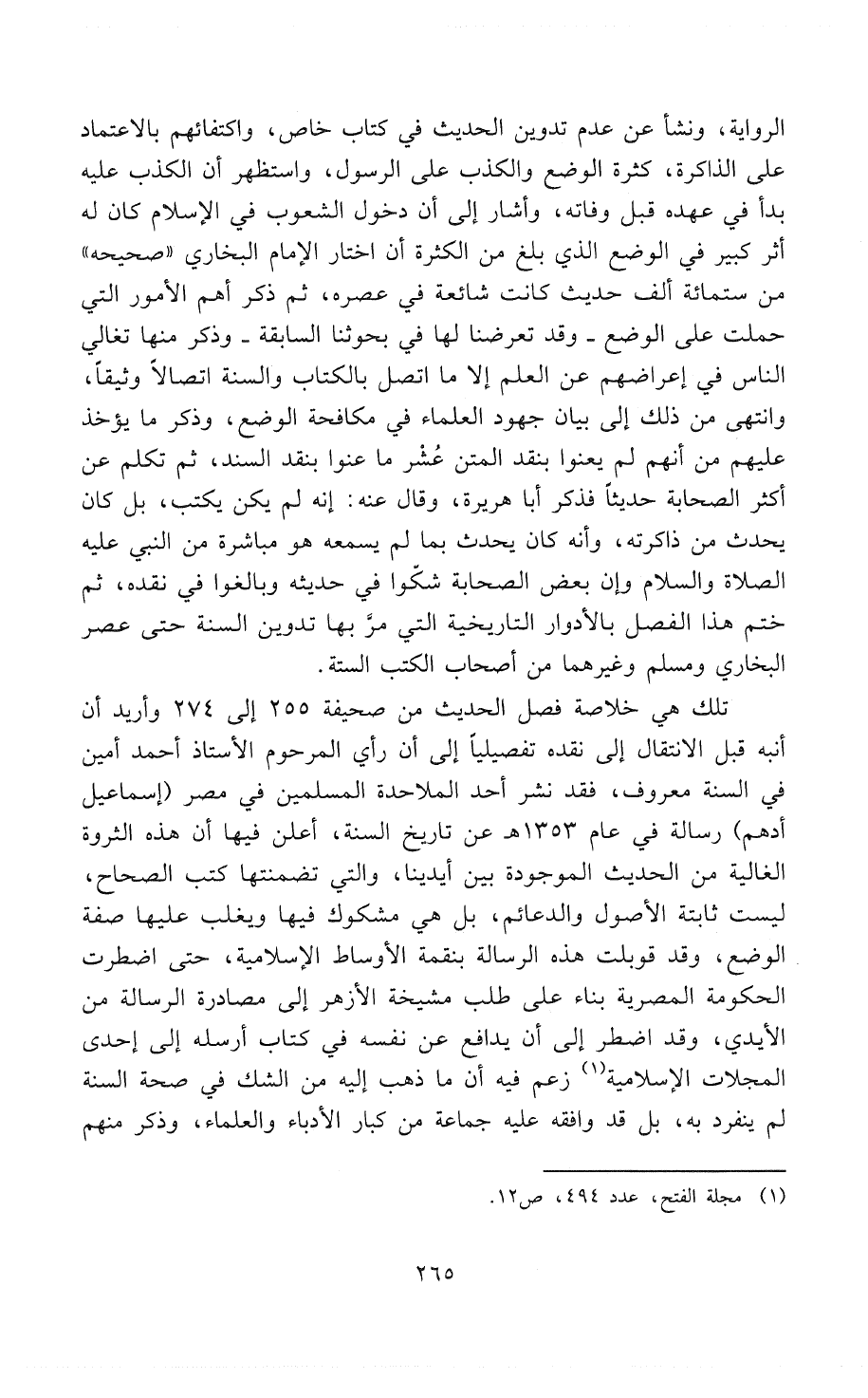 الرواية، ونشأ عن عدم تدوين الحديث في كتاب خاص، واكتفائهم بالاعتماد على الذاكرة، كثرة الوضع والكذب على الرسول، واستظهر أن الكذب عليه بدأ في عهده قبل وفاته، وأشار إلى أن دخول الشعوب في الإسلام كان له أثر كبير في الوضع الذي بلغ من الكثرة أن اختار الإمام البخاري " صحيحه " من ستمائة ألف حديث كانت شائعة في عصره، ثم ذكر أهم الأمور الي حملت على الوضع - وقد تعرضنا لها في بحوثنا السابقة - وذكر منها تغالي الناس في إعراضهم عن العلم إلا ما اتصل بالكتاب وَالسُنَّةُ اتصالاً وثيقاً، وانتهى من ذلك إلى بيان جهود العلماء في مكافحة الوضع، وذكر ما يؤخذ عليهم من أنهم لم يعنوا بنقد المتن عُشْرَ ما عنوا بنقد السند، ثم تكلم عن أكثر الصحابة حَدِيثًا فذكر أبا هريرة، وقال عنه: إنه لم يكن يكتب، بل كان يُحَدِّث من ذاكرته، وأنه كان يُحَدِّث بما لم يسمعه هو مباشرة من النَّبِيّ- عَلَيْهِ الصَلاَةُ وَالسَّلاَمُ - وإن بعض الصحابة شَكُّوا في حديثه وبالغوا في نقده، ثم ختم هذا الفصل بالأدوار التاريخية الي مَرَّ بها تدوين السُنَّة حتى عصر البخاري ومسلم وغيرهما من أصحاب " الكتب الستة ".