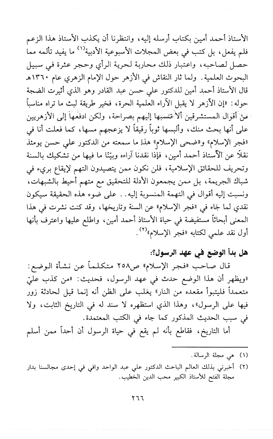 الأستاذ أحمد أمين بكتاب أرسله إليه، وانتظرنا أَنْ يُكَذِّبَ الأستاذُ هذا الزعم فلم يفعل، بل كتب في بعض المجلات الأسبوعية الأدبية (¬1) ما يفيد تَأَلُّمَهُ مِمَّا حصل لصاحبه، واعتبار ذلك محاربة لحرية الرأي وحجر عثرة في سبيل البحوث العِلْمِيَّةِ. ولما ثار النقاش في الأزهر حول الإمام الزُّهْرِي عام 1360 هـ قال الأستاذ أحمدأمين للدكتور علي حسن عبد القادر وهو الذي أثيرت الضجة حوله: «إِنَّ الأزهر لاَ يقبل الأراء العِلْمِيَّةَ الحرة، فخير طريقة لبث ما تراه مناسبًا من أقوال المُسْتَشْرِقِينَ ألاَّ تنسبها إليهم بصراحة، ولكن ادفعها إلى الأزهريِّين على أنها بحث منك، وألبسها ثوبًا رقيقًا لا يزعجهم مسها، كما فعلتُ أنا في " فجر الإسلام " و" ضُحَاهُ " هذا ما سمعته من الدكتور علي حسن يؤمئذٍ نقلاً عن الأستاذ أحمد أمين، فإذا نقدنا آراءه وَبَيَنَّا ما فيها من تشكيك بِالسُنَّةِ وتحريف للحقائق الإسلامية، فلن نكون مِمَّنْ يَتَصَيَّدُونَ التُّهَمَ لإيقاع بريء في شباك الجريمة، بل مِمَّنْ يجمعون الأدلة للتحقيق مع مُتَّهَمٍ أحيط بالشبهات، ونسبت إليه أقوال في التهمة المنسوبة إليه .. على ضوء هذه الحقيقة سيكون نقدي لما جاء في " فجر الإسلام " عَنْ السُنَّةِ وتاريخها، وقد كنتُ نشرت في هذا العنى أبحاثًا مستفيضة في حياة الأستاذ أحمد أمين، واطلع عليها واعترف بأنها أول نقد علمي لكتابه " فجر الإسلام " (¬2).