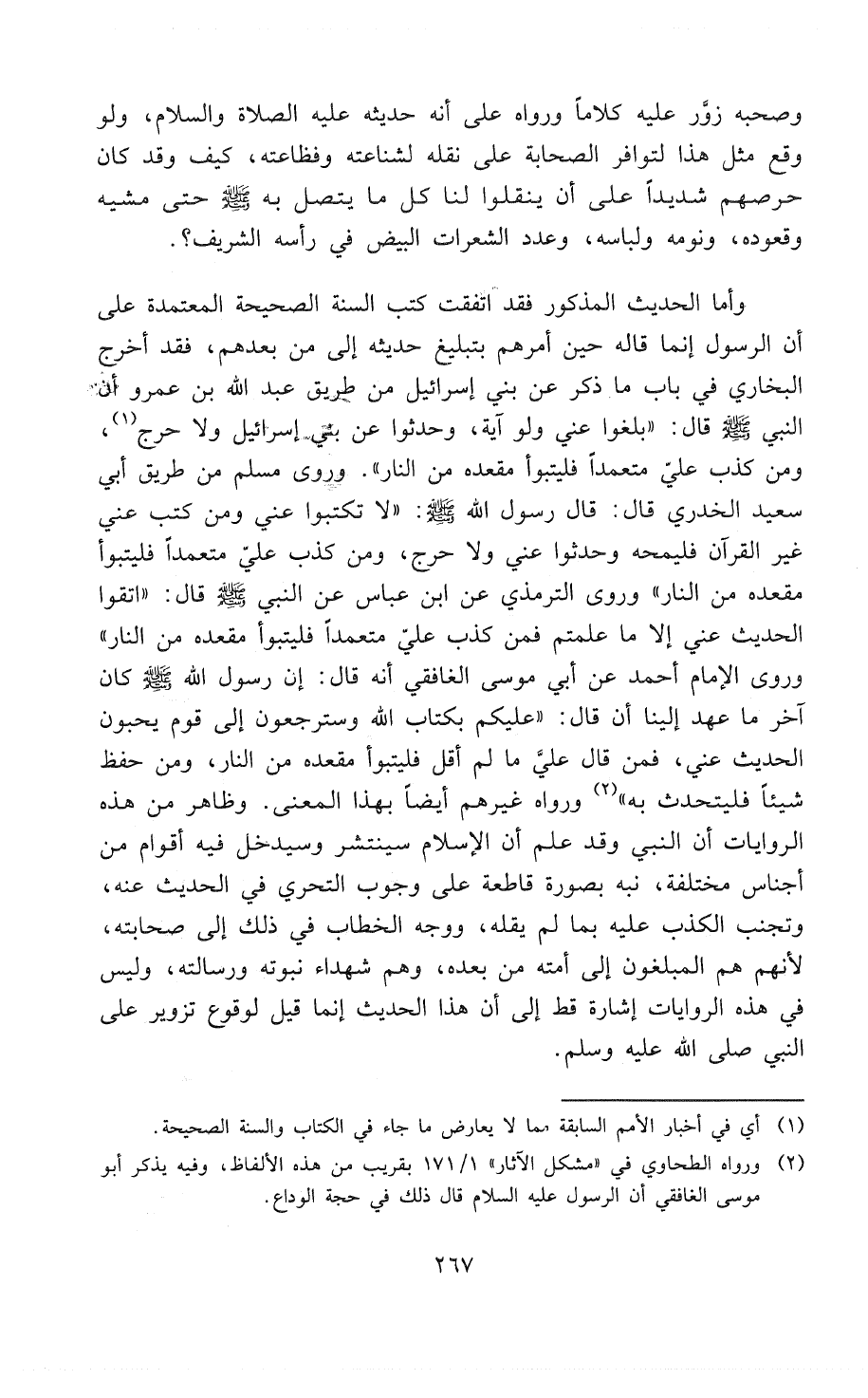 وأما الحديث المذكور فقد اتفقت كُتُبُ السُنَّة الصحيحة المعتمدة على أن الرسول إنما قاله حين أمرهم بتبليغ حديثه إلى من بعدهم، فقد أخرج " البخاري " في باب ما ذكر عن بني إسرائيل من طريق عبد الله بن عمرو أن النَّبِيّ- صَلَّى اللهُ عَلَيْهِ وَسَلَّمَ - قال: «بَلِّغُوا عَنِّي وَلَوْ آيَةً، وَحَدِّثُوا عَنْ بَنِي إِسْرَائِيلَ وَلاَ حَرَجَ (¬1)، وَمَنْ كَذَبَ عَلَيَّ مُتَعَمِّدًا فَلْيَتَبَوَّأْ مَقْعَدَهُ مِنَ النَّارِ». وروى مسلم من طريق أبي سعيد الخُدري قال: قال رسول الله - صَلَّى اللهُ عَلَيْهِ وَسَلَّمَ -: «لاَ تَكْتُبُوا عَنِّي، وَمَنْ كَتَبَ عَنِّي غَيْرَ الْقُرْآنِ فَلْيَمْحُهُ، وَحَدِّثُوا عَنِّي وَلاَ حَرَجَ، وَمَنْ كَذَبَ عَلَيَّ مُتَعَمِّدًا فَلْيَتَبَوَّأْ مَقْعَدَهُ مِنْ النَّارِ» وروى الترمذي عن ابن عباس عَنْ النَّبِيِّ- صَلَّى اللهُ عَلَيْهِ وَسَلَّمَ - قال: «اتَّقُوا الْحَدِيثَ عَنِّي إِلاَّ مَا عَلِمْتُمْ فَمَنْ كَذَبَ عَلَيَّ مُتَعَمِّدًا فَلْيَتَبَوَّأْ مَقْعَدَهُ مِنْ النَّارِ» وروى الإمام أحمد عَنْ أَبِي مُوسَى الْغَافِقِيَّ أَنَّ رَسُولَ اللهِ - صَلَّى اللهُ عَلَيْهِ وَسَلَّمَ - كَانَ آخِرُ مَا عَهِدَ إِلَيْنَا أَنْ قَالَ: «عَلَيْكُمْ بِكِتَابِ اللهِ، وَسَتَرْجِعُونَ إِلَى قَوْمٍ يُحِبُّونَ الْحَدِيثَ عَنِّي، فَمَنْ قَالَ عَلَيَّ مَا لَمْ أَقُلْ، فَلْيَتَبَوَّأْ مَقْعَدَهُ مِنَ النَّارِ، وَمَنْ حِفْظَ عَنِّي شَيْئًا [فَلْيُحَدِّثْهُ]» (¬2) ورواه غيرهم أيضاًً بهذا المعنى. وظاهر من هذه الروايات أن النَّبِيَّ وقد علم أن الإسلام سينتشر وسيدخل فيه أقوام من أجناس مختلفة، نَبَّهَ بصورة قاطعة على وجوب التَحَرِّي في الحديث عنه، وَتَجَنُّبِ الكذب عليه بما لم يقله، ووجه الخطاب في ذلك إلى صحابته، لأنهم هم المثبَلِّغُونَ إلى أُمَّتِهِ من بعده، وهم شهداء نبوته ورسالته: وليس في هذه الروايات إشارة قط إلى أن هذا الحديث إنما قيل لوقوع تزوير على النَّبِيّ- صَلَّى اللهُ عَلَيْهِ وَسَلَّمَ -.