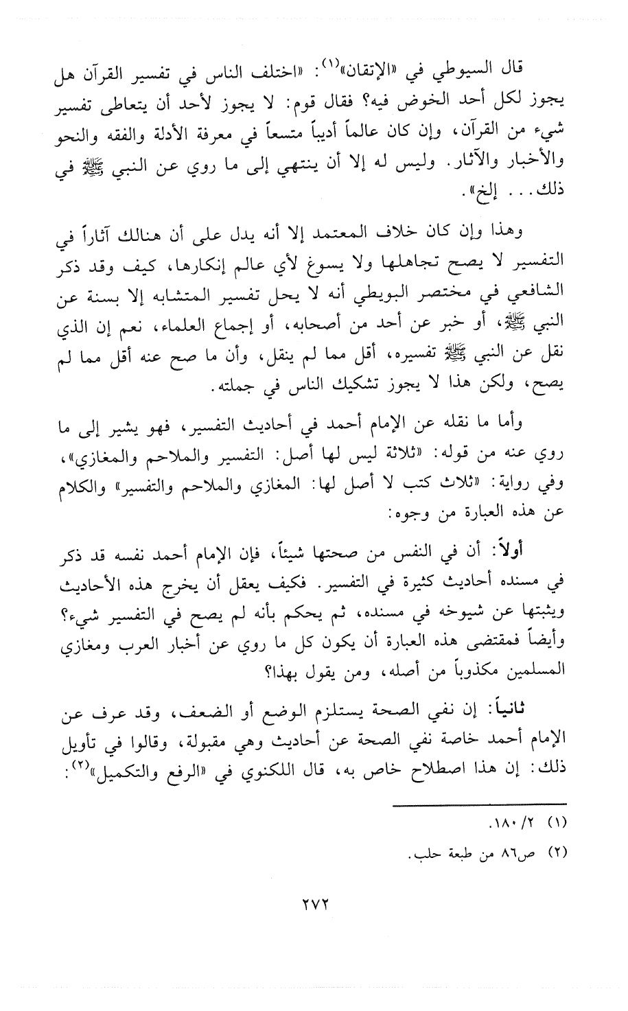 وأما ما نقله عن الإمام أحمد في أحاديث التفسير، فهو يشير إلى ما روي عنه من قوله: «ثَلاَثَةُ لَيْسَ لَهَا أَصْلٌ: التَفْسِيرُ، وَالمَلاَحِمُ وَالمَغَازِي»، وفي رواية: «[ثَلاَثَةُ] كُتُبٍ لاَ أَصْلَ لَهَا: المَغَازِي وَالمَلاَحِمُ وَالتَفْسِيرُ» والكلام عن هذه العبارة من وجوه:
