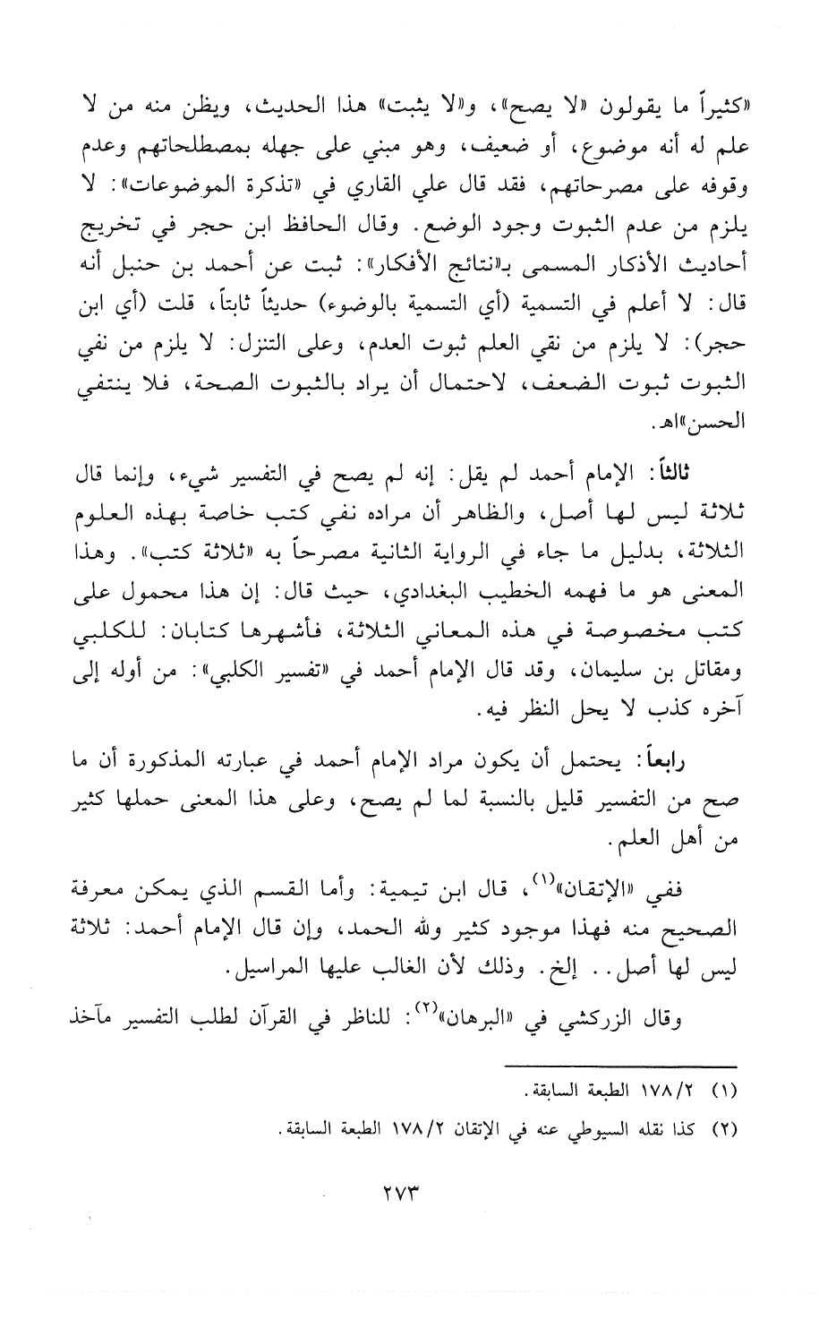 ثَالِثاًً - الإمام أحمد لم يقل: إنه لم يصح في التفسير شيء، وإنما قال: «ثَلاَثَةُ لَيْسَ لَهَا أَصْلٌ»، والظاهر أن مراده نفي كتب خاصة بهذه العلوم الثلاثة، بدليل ما جاء في الرواية الثانية مُصَرِّحاً به «ثَلاَثَةُ كُتُبٍ». وهذا المعنى هو ما فهمه الخطيب البغدادي، حيث قال: «وَهَذَا مَحْمُولٌ عَلَى كُتُبٍ مَخْصُوصَةٍ فِي هَذِهِ الْمَعَانِي الثَّلَاثَةِ [غَيْرِ مُعْتَمَدٍ عَلَيْهَا لِعَدَمِ عَدَالَةِ نَاقِلِيهَا وَزِيَادَاتِ الْقُصَّاصِ فِيهَا فَأَمَّا كُتُبُ الْمَلاَحِمِ فَجَمِيعُهَا بِهَذِهِ الصِّفَةِ وَلْيَسَ يَصِحُّ فِي ذِكْرِ الْمَلاَحِمِ الْمُرْتَقَبَةِ وَالفِتَنِ الْمُنْتَظَرَةِ غَيْرُ أَحَادِيثَ يَسِيرَةٍ، وَأَمَّا كُتُبُ التَّفْسِيرِ] فَمِنْ أَشْهَرَهَا كِتَابَا الْكَلْبِيِّ وَمُقَاتِلِ بْنِ سُلَيْمَانَ، وَقَدْ قَالَ أَحْمَدُ فِي " تَفْسِيرِ الْكَلْبِيِّ ": " مِنْ أَوَّلِهِ إِلَى آخِرِهِ كَذِبٌ [قِيلَ لَهُ: فَيَحِلُّ النَّظَرُ فِيهِ؟] قَالَ: لاَ "».