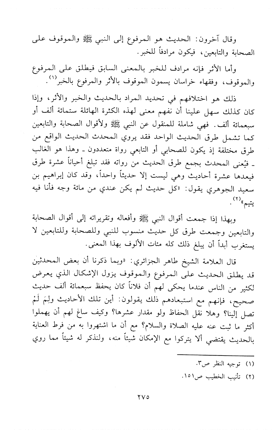 قال العلامة الشيخ طاهرِ الجزأئري: «وبما ذكرِنا أن بعض المُحَدِّثِينَ قد يطلق الحديث على المرفوع والموقوف يزول الإشكال الذي يعرِض لكثير من الناس عندما يحكى لهم أن فلاناً كان يحفظ سبعمائة ألف حديث صحيح، فإنهم مع استبعادهم ذلك يقولون: أين تلك الأحاديث ولِمَ لَمْ تصل إلينا؟ وهلا نقل الحفاظ ولو مقدار عشرها؟ وكيف ساغ لهم أن يهملوا أكثر ما ثبت عنه - عَلَيْهِ الصَلاَةُ وَالسَّلاَمُ -؟ مع أن ما أشتهروا به من فرط العناية بالحديث يقتضي أَلاَّ يترِكوا مع الإمكان شيئاً منه، ولنذكرِ له شيئاً مِمَّا رُوِيَ