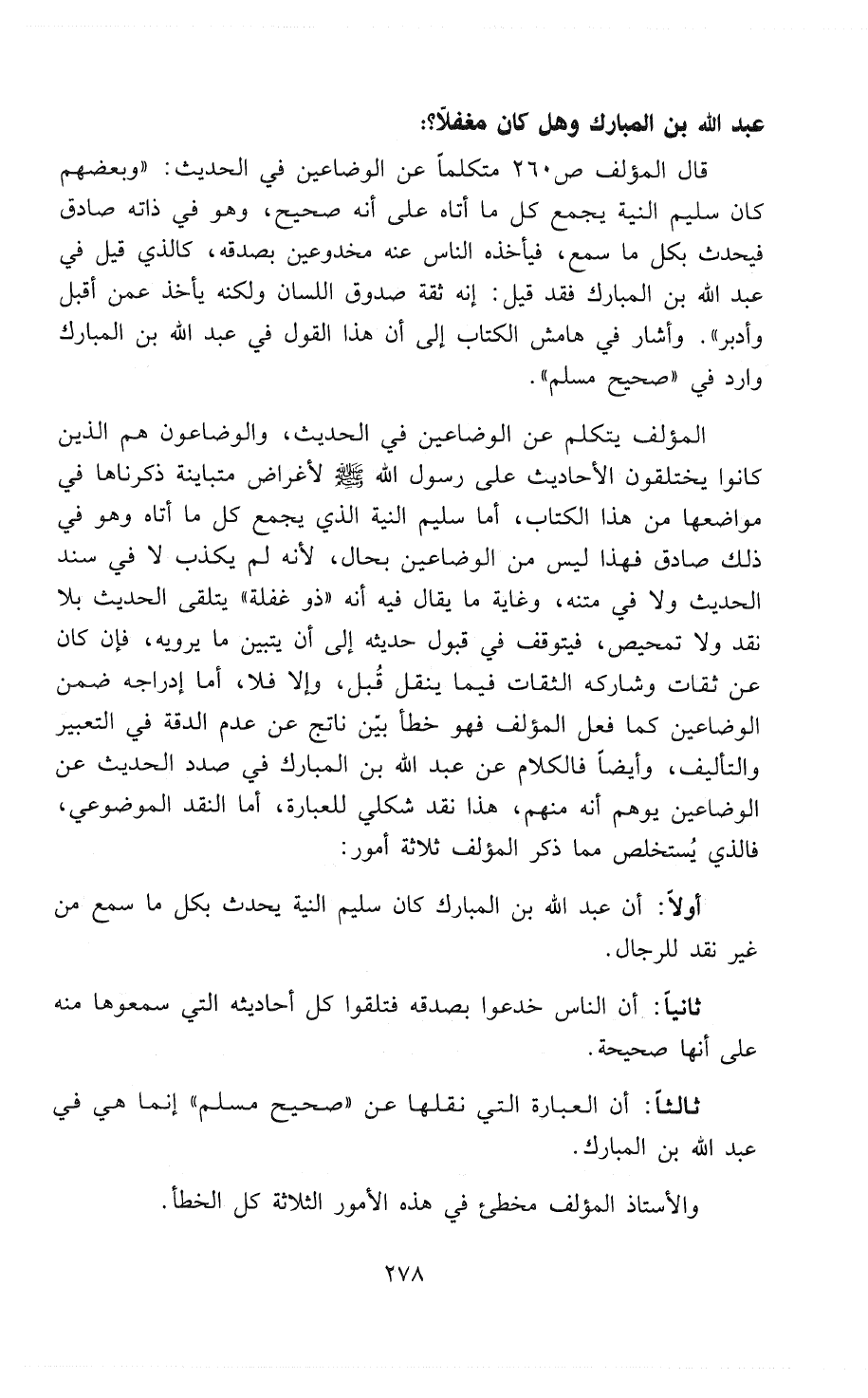 ثالثاً: أن العبارة التي نقلها عن " صحيح مسلم " إنما هي في عبد الله بن المبارك.