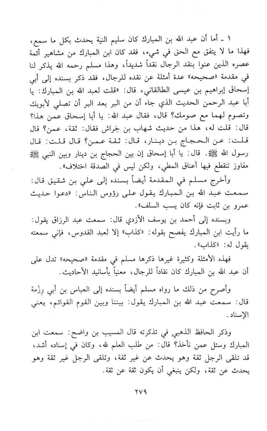 11 - أما أن عبد الله بن المبارك كان سليم النية يُحَدِّث بكل ما سمع، فهذا ما لا يتفق مع الحق في شيء، فقد كان ابن المبارك من مشاهير أئمة عصره الذين عنوا بنقد الرجال نقداً شديداً، وهذا مسلم - رَحِمَهُ اللهُ - يذكرِ لنا في " مقدمة صحيحه " عدة أمثلة عن نقده للرجال، فقد ذكر بسنده إلى أبي إسحاق إبراهيم بن عيسى الطالقاني، قال: قلت لعبد الله بن المبارك: يا أبا عبد الرحمن الحديث الذي جاء: «إِنَّ مِنَ الْبِرِّ بَعْدَ الْبِرِّ أَنْ تُصَلِّيَ لأَبَوَيْكَ مَعَ صَلاَتِكَ، وَتَصُومَ لَهُمَا مَعَ صَوْمِكَ»؟ قال: فقال عبد الله: يا أبا إسحاق عمن هذا؟ قال: قلت له، هذا من حديث شهاب بن خِراش فقال: ثقة، عمن؟ قال: قلت: عن الحجاج بن دينار، قال: ثقة، قال: قلت: قال رسول الله - صَلََّى اللهُ عَلَيْهِ وَسَلَّمَ -. قال: يا أبا إسحاق إن بين الحجاج بن دينار وبين النَّبِيّ- صَلََّى اللهُ عَلَيْهِ وَسَلَّمَ - مفاوز تنقطع فيها أعناق المطي، ولكن ليس في الصدقة اختلاف».