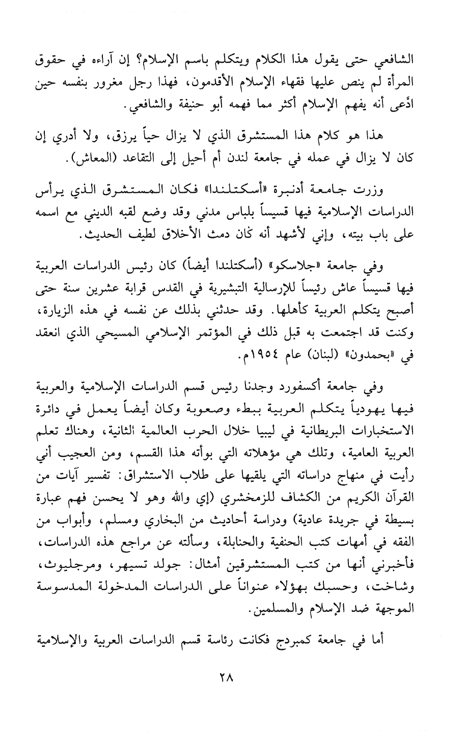 وَزُرْتُ جامعة أدنبرة «أسكتلندا» فكان المستشرق الذي يرأس الدراسات الإسلامية فيها قِسِّيسًا بلباس مدني وقد وضع لقبه الديني مع اسمه على باب بيته، وإني لأشهد أنه كان دمث الأخلاق لطيف الحديث.