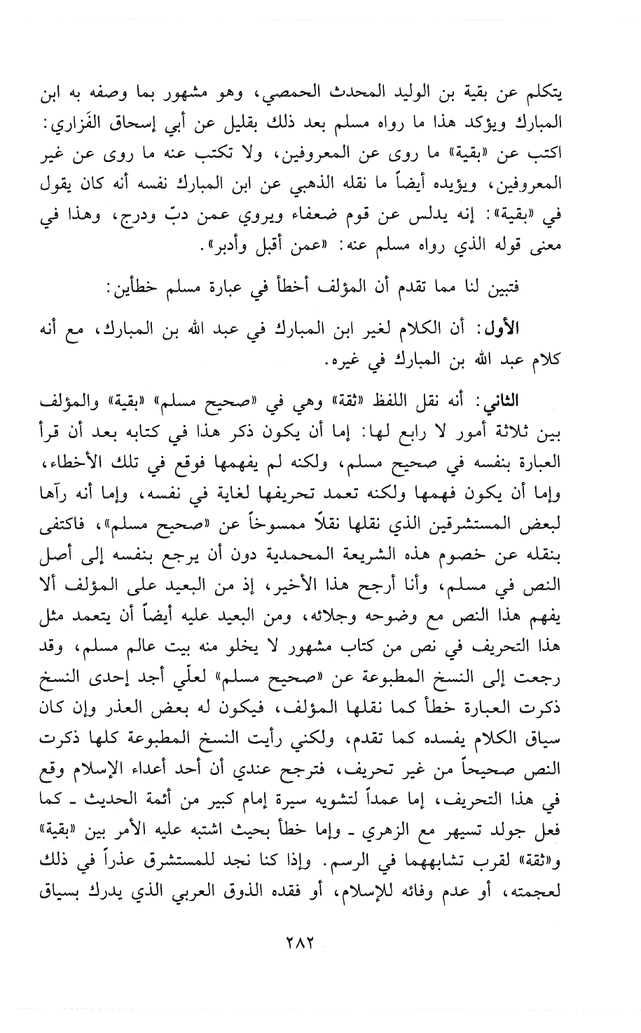 الثاني - أنه نقل اللفظ «ثِقَةٌ» وهي في " صحيح مسلم " «بَقِيَّةٌ» والمؤلف بين ثلاثة أمور لا رابع لها: إما أن يكون ذكر هذا في كتابه بعد أن قرأ العبارة بنفسه في " صحيح مسلم "، ولكنه لم يفهمها فوقع في تلك الأخطاء، وإما أن يكون فهمها ولكنه تَعَمَّدَ تحريفها لغاية في نفسه، وإما أنه رآها لبعض المُسْتَشْرِقِينَ الذي نقلها نَقْلاً مَمْسُوخًا من " صحيح مسلم "، فاكتفى بنقله عن خصوم الشريعة المحمدية دُونَ أن يرجع بنفسه إلى أصل النص في " مسلم "، وأنا أُرَجِّحُ هذا الأخير، إذ من البعيد على المؤلف أَلاَّ يفهم هذا النص مع وضوحه وجلائه، ومن البعيد عليه أيضاًَ أن يَتَعَمَّدَ مثل هذا التحريف في نص كتاب مشهور لا يخلو منه بيت عالم مسلم، وقد رجعت إلى النسخ المطبوعة عن " صحيح مسلم " لَعَلِّي أجد إحدى النسخ ذكَرَتْ العبارةَ خطأ كما نقلها المؤلف، فيكون له بعض العذر وإن كان سياق الكلام يفسده كما تقدم، ولكني رأيت النُّسَخَ المطبوعة كلها ذكرت النص صحيحاً من غير تحريف، فَتَرَجَّحَ عندي أن أحد أعداء الإسلام وقع في هذا التحريف، إما عَمْدًا لتشويه سيرة إمام كبير من أئمة الحديث - كما فعل جولدتسيهر مع الزُّهْرِي - وإما خطأً بحيث اشتبه عليه الأمر بين " بقية " و" ثقة " لقرب تشابههما في الرسم. وإذا كنا نجد للمستشرقين عُذْراً في ذلك لعجمته، أو عدم وفائه للإسلام، أو فقده الذوق العربي الذي يُدْرِكُ بسياق