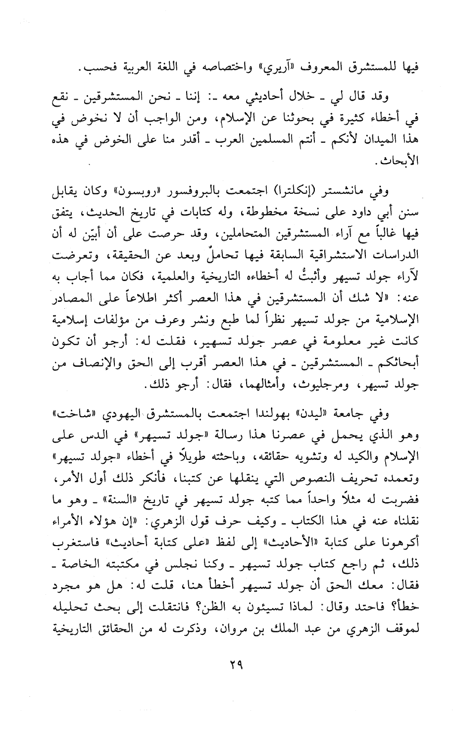وفي مانشستر (إنكلترا) اجتمعت بالبروفسور «رُوبْسُونْ» وكان يقابل " سنن أبي داود " على نسخة مخطوطة، وله كتابات في تاريخ الحديث، يتفق فيها غالباً مع آراء المُسْتَشْرِقِينَ المُتَحَامِلِينَ، وقد حرصت على أن أُبَيِّنَ له أن الدراسات الاستشراقية السابقة فيها تَحَامُلٌ وَبُعْدٌ عَنْ الحَقِيقَةِ، وتعرضت لآراء جولدتسيهر وَأَثْبَتُُّّ له أخطاءه التاريخية والعلمية، فكان مِمَّا أجاب به عنه: «لاَ شَكَّ أَنَّ المُسْتَشْرِقِينَ فِي هَذَا العَصْرِ أَكْثَرَ إِطِّلاَعًا عَلَى المَصَادِرِ الإِسْلاَمِيَّةِ مِنْ جُوَلْدْتْسِيهِرْ نَظَرًا لِمَا طُبِعَ وَنُشِرَ وَعُرِفَ مِنْ مُؤَلَّفَاتٍ إِسْلامِيَّةٍ كَانَتْ غَيْرَ مَعْلُومَةٍ فِي عَصْرِ جُوَلْدْتْسِيهِرْ»، فَقُلْتُ لَهُ: «أرجو أن تكون أبحاثكم - المُسْتَشْرِقِينَ - في هذا العصر أقرب إلى الحق والإنصاف من جولدتسيهر، ومرجليوث، وأمثالهما، فقال: أرجو ذلك».