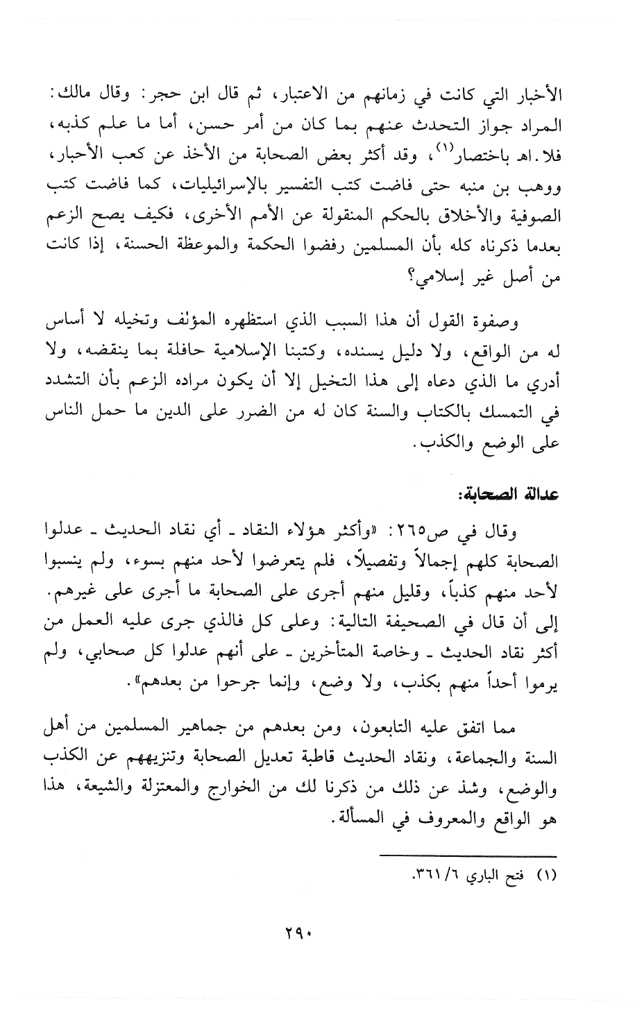 وقال في [ص 265]: «وأكثر هؤلاء النُقَّاد - أي نُقَّادِ الحديث - عَدَّلُوا الصحابة كلهم إجمالاً وتفصيلاً، فلم يتعرضوا لأحد منهم بسوء، ولم ينسبوا لأحد منهم كَذِباً، وقليل منهم أجرى على الصحابة ما أجرى على غيرهم». إلى أن قال: في الصحيفة التالية «وعلى كل فالذي جرى عليه العمل من أكثر نُقَّادِ الحديث - وخاصة المتأخرين - على أنهم عَدَّلُوا كل صحابي، ولم يرموا أحداً منهم بكذب، ولا وضع، وإنما جَرَّحُوا من بعدهم».