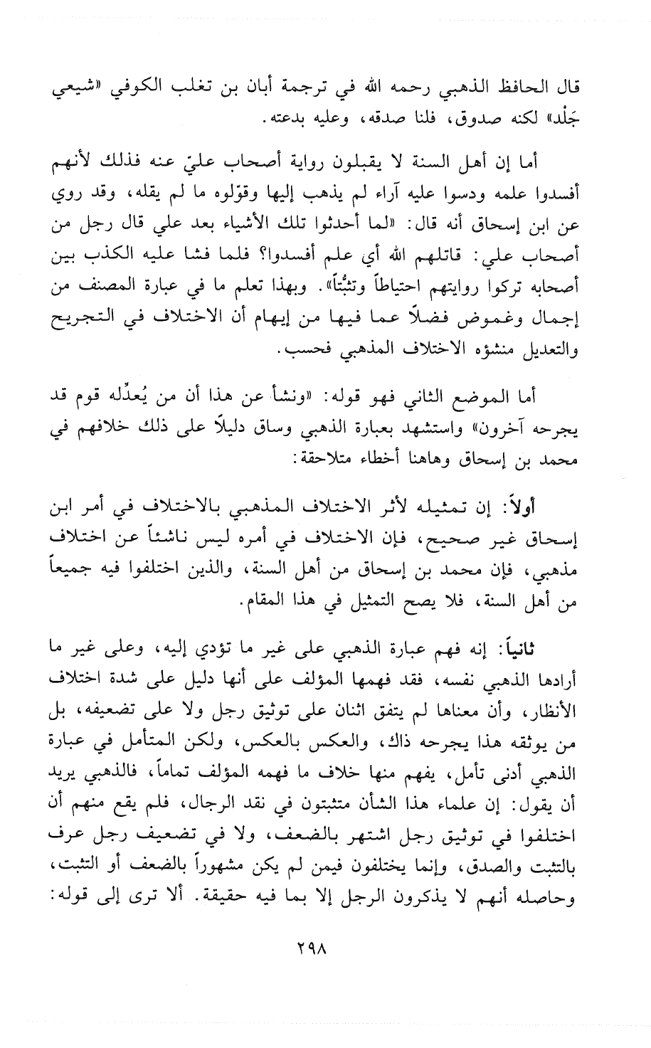 أَوَلاًً - إن تمثيله لأثر الاختلاف المذهبي بالاختلاف في أمر ابن إسحاق غير صحيح، فإن الاختلاف في أمره ليس ناشئاً عن اختلاف مذهبي، فإن محمد بن إسحاق من أهل السُنَّة، والذين اختلفوا فيه جميعاً من أهل السُنَّة، فلا يصح التمثيل في هذا المقام.
