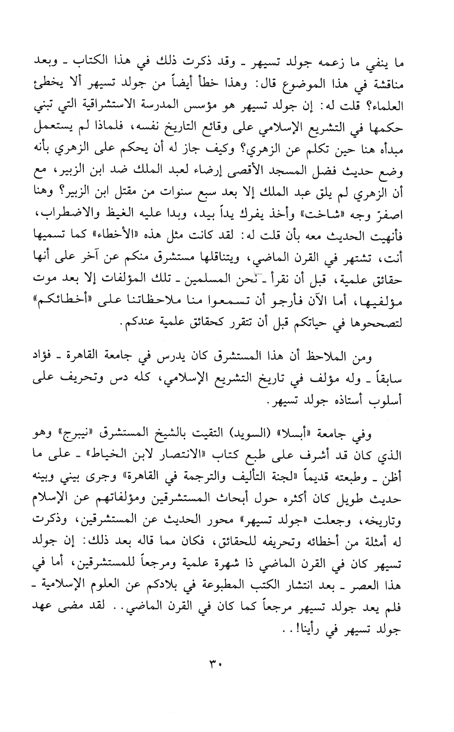 ما ينفي ما زعمه جولدتسيهر - وقد ذكرت ذلك في هذا الكتاب - وبعد مناقشة في هذا الموضوع قال: وهذا خطأ أيضاً من جولدتسيهر، ألاَ يخطئ العلماء؟ قلتُ له: إن جولدتسيهر هو مؤسس المدرسة الاستشراقية التي تبني حُكمها في التشريع الإسلامي على وقائع التاريخ نفسه، فلماذا لم يستعمل مبدأه هنا حين تكلم عن الزُّهْرِي؟ وكيف جاز له أن يحكم على الزُّهْرِي بأنه وضع حديث فضل المسجد الأقصى إرضاء لعبد الملك ضد ابن الزبير، مع أن الزُّهْرِي لم يلق عبد الملك إلا بعد سبع سنوات من مقتل ابن الزبير؟ وهنا اصفرَّ وجه «شَاخْتْ» وأخذ يفرك يداً بيد. وبدا عليه الغيظ والاضطراب، فأنهيت الحديث معه بأن قلت له: لقد كانت مثل هذه «الأخطاء» كما تسميها أنت، تشتهر في القرن الماضي، ويتناقلها مستشرق منكم عن آخر على أنها حقائق علمية، قبل أن نقرأ - نحن المُسْلِمِينَ - تلك المؤلفات إلا بعد موت مؤلفيها، أما الآن فأرجو أن تسمعوا منا ملاحظاتنا على «أخطائكم» لتصحِّحُوها في حياتكم قبل أن تتقرر كحقائق علمية عندكم.