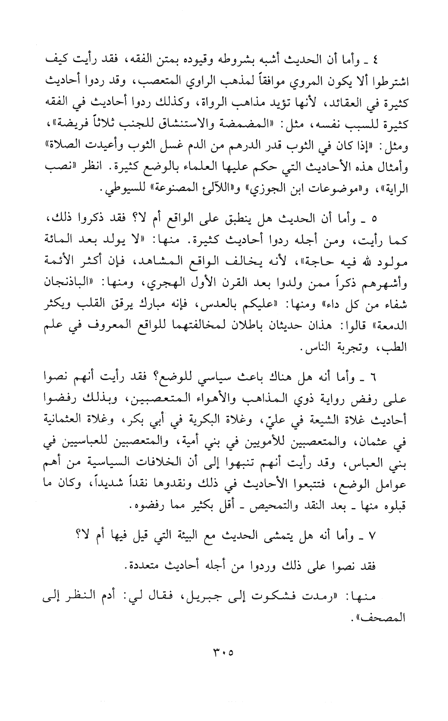 4 - وأما أن الحديث أشبه بشروطه وقيوده بمتن الفقه، فقد رأيت كيف اشترطوا ألا يكون المروي موافقاً لمذهب الراوي المتعصب، وقد رَدُّوا أحاديث كثيرة في العقائد، لأنها تؤيد مذاهب الرُوَاةِ، وكذلك رَدُّوا أحاديث في الفقه كثيرة للسبب نفسه، مثل: «الْمَضْمَضَةُ وَالاسْتِنْشَاقَ لِلْجُنُبِ ثَلاَثًا فَرِيضَةً»، ومثل: «إِذَا كَانَ فِي الثَّوْبِ قَدْرُ الدِّرْهَمِ مِنَ الدَّمِ غُسِلَ الثَّوْبُ وَأُعِيدَتِ الصَّلاَةُ» وأمثال هذه الأحاديث التي حكم عليها العلماء بالوضع كثيرة. انظر " نصب الراية "، و"موضوعات ابن الجوزي " و"اللآلئ المصنوعة " للسيوطي.
