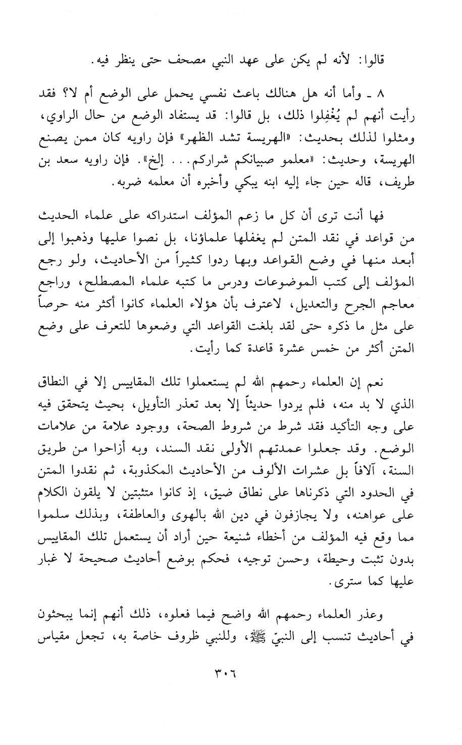 فها أنت ترى أن كل ما زعم المؤلف استدراكه على علماء الحديث من قواعد في نقد المتن لم يغفلها علماؤنا بل نَصُّوا عليها وذهبوا إلى أبعد منها في وضع القواعد وبها رَدُّوا كثيراً من الأحاديث، ولو رجع المؤلف إلى كتب الموضوعات ودرس ما كتبه علماء المصطلح، وراجع معاجم الجرح والتعديل، لاعترف بأن هؤلاء العلماء كانوا أكثر منه حرصاً على مثل ما ذكره حتى لقد بلغت القواعد التي وضعوها للتعرف على وضع المتن أكثر من خمس عشرة قاعدة كما رأيت.