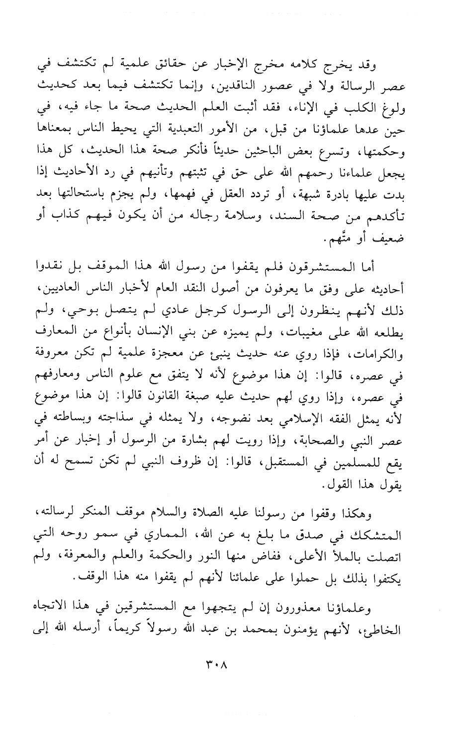 وقد يخرج كلامه مخرج الإخبار عن حقائق علمية لم تكتشف في عصر الرسالة ولا في عصور الناقدين، وإنما تكتشف فيما بعد كحديث «وُلُوغِ الكَلْبِ فِي الإِنَاءِ»، فقد أثبت العلم الحديث صحة ما جاء فيه، في حين عَدَّهَا علماؤنا من قبل، من الأمور التَّعَبُّدِيَّةِ التي يحيط الناس بمعناها وحكمتها، وَتَسَرَّعَ بعض الباحثين حَدِيثًا فأنكر حُجَّةَ هدْا الحديث، كُلُّ هذا يجعل علماءنا - رَحِمَهُمْ اللهُ - على حق في تَثَبُّتِهِمْ وَتَأَنِّيهِمْ في رَدِّ الأحاديث إذا بدت عليها بادرة شبهة، أو تردد العقل في فهمها، ولم يجزم باستحالتها بعد تأكدهم من صحة السند، وسلامة رجاله من أن يكون فيهم كذاب أو ضعيف أو مُتَّهَمٍ. أما المُسْتَشْرِقُونَ فلم يقفوا من رسول الله هذا الموقف بل نقدوا أحاديثه على وفق ما يعرفون من أصول النقد العام لأخبار الناس العاديين، ذلك لأنهم ينظرون إلى الرسول كرجل عادي لم يتصل بوحي، ولم يطلعه الله على مغيبات، ولم يُمَيِّزْهُ عن بني الإنسان بأنواع من المعارف والكرامات، فإذا روي عَنْهُ حديث يُنْبِىءُ عن معجزة علمية لم تكن معروفة في عصره، قالوا: إن هذا موضوع لأنه لا يتفق مع علوم الناس ومعارفهم في عصره، وإذا رُوِيَ لهم حديث عليه صبغة القانون قالوا: إن هذا موضوع لأنه يمثل الفقه بعد نضوجه، ولا يمثله في سذاجته وبساطته في عصر النَّبِيّوالصحابة، وإدا رويت لهم بشارة من الرسول أو إخبار عن أمر يقع للمسلمين في المستقبل، قالوا: إن ظروف النَّبِيّلم تكن تسمح له أن يقول هذا القول.