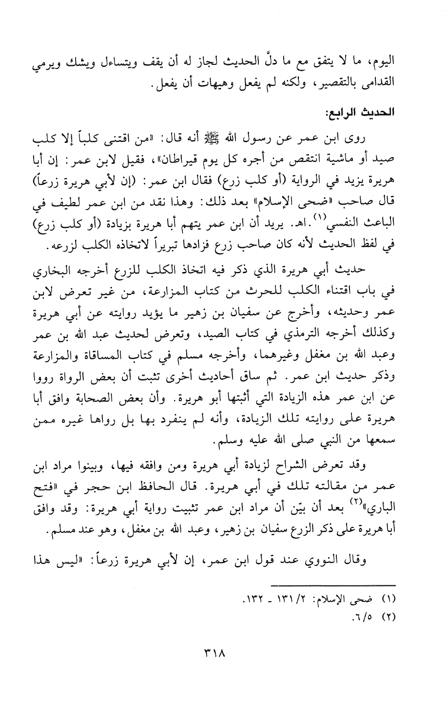 حديث أبي هريرة الذي ذكر فيه اتخاذ الكلب للزرع أخرجه " البخاري " في (باب اقتناء الكلب للحرث من كتاب المزارعة) من غير تعرض لابن عمر وحديثه، وأخرج عن سفيان بن زهير ما يؤيد روايته عن أبي هريرة وكذلك أخرجه "الترمذي " في (كتاب الصيد) "، وتعرض لحديث عبد الله بن عمر وعبد الله بن مغفل وغيرهما، وأخرجه "مسلم " في (كتاب المساقاة والمزارعة) وذكر حديث ابن عمر. ثم ساق أحاديث أخرى تثبت أن بعض الرُوَاة رَوَوْا عن ابن عمر هذه الزيادة التي أثبتها أبو هريرة. وأن بعض الصحابة وافق أبا هريرة على روايته تلك الزيادة، وأنه لم ينفرد بها بل رواها غيره مِمَّنْ سمعها من النَّبِيّ- صَلََّى اللهُ عَلَيْهِ وَسَلَّمَ -.