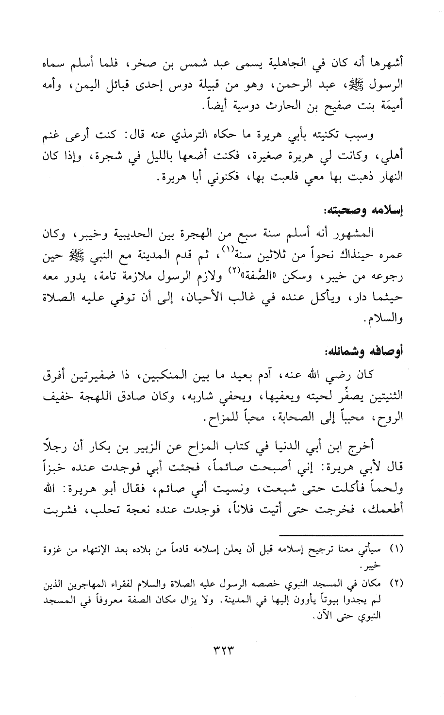 المشهور أنه أسلم سَنَةَ سبع من الهجرة بين الحديبية وخيبر، وكان عمره حينذاك نحواً من ثلاثين سَنَةٍ (¬1)، ثم قدم المدينة مع النَّبِيِّ - صَلََّى اللهُ عَلَيْهِ وَسَلَّمَ - حين رجوعه من خيبر، وسكن «الصُفَّةَ» (¬2) ولازم الرسول ملازمة تَامَّةً، يدور معه حيثما دار، ويأكل عنده في غالب الأحيان، إلى أن تُوُفِّيَ - عَلَيْهِ الصَلاَةُ وَالسَّلاَمُ -.