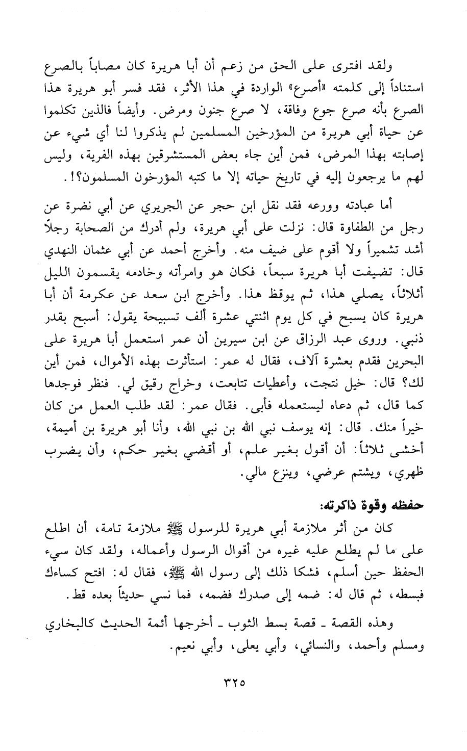 ولقد افترى على الحق من زعم أن أبا هريرة كان مُصَاباً بالصرع استناداً إلى كلمته «أُصْرَعُ» الواردة في هذا الأثر، فقد فسر أبو هريرة هذا الصرع بأنه صرع جوع وَفَاقَةٍ، لا صرع جنون ومرض. وأيضاًً فالذين تكلموا في حياة أبي هريرة من المُؤَرِّخِينَ المُسْلِمِينَ لم يذكروا لنا أي شيء عن إصابته بهذا المرض، فمن أين جاء بعض المُسْتَشْرِقِينَ بهذه الفرية، وليس لهم ما يرجعون إليه في تاريخ حياته إلا ما كتبه المُؤَرِّخُونَ المُسْلِمُونَ؟!.