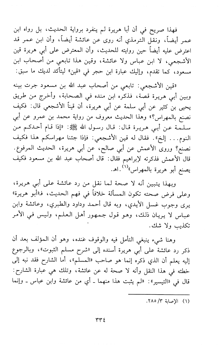 وبهذا يَتَبَيَّنُ أنه لا صحة لما نقل من رَدِّ عائشة على أبي هريرة، وعلى فرض صحته تكون المسألة خلافاً في فهم الحديث، فـ «أبو هريرة» يرى وجوب غسل الأيدي، وبه قال أحمد وأبو داود والطبري، وعائشة وابن عباس لا يريان ذلك، وهو قول جمهور أهل العلم، وليس في الأمر تكذيب ولا شك.
