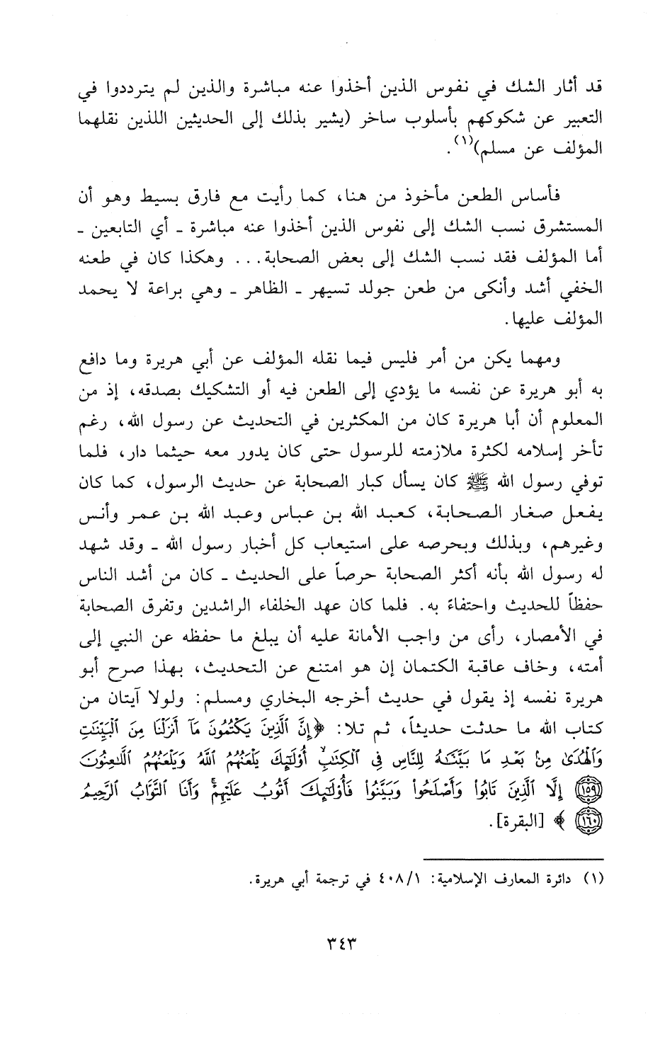 ومهما يكن من أمر فليس فيما نقله المؤلف عن أبي هريرة وما دافع به أبو هريرة عن نفسه ما يؤدي إلى الطعن فيه أو التشكيك بصدقه، إذ من المعلوم أن أبا هريرة كان من المكثرين في التحديث عن رسول الله، رغم تأخُّر إسلامه لكثرة ملازمته للرسول حتى كان يدور معه حيثما دار، فلما توفي الرسول - صَلََّى اللهُ عَلَيْهِ وَسَلَّمَ - كان يسأل كبار الصحابة عن حديث الرسول، كما كان يفعل صغار الصحابة، كعبد الله بن عباس وعبد الله بن عمر وأنس وغيرهم، وبذلك وبحرصه على استيعاب كل أخبار رسول الله - بأنه أكثر الصحابة حرصاً على الحديث - كان من أشد الناس حفظاً للحديث واحتفاءً به. فلما كان عهد الخلفاء الراشدين وتفرق الصحابة في الأمصار، رأى من واجب الأمانة عليه أن يُبَلِّغَ ما حفظه عَنْ النَّبِيِّ إلى أُمَّتِهِ، وخاف عاقبة الكتمان إن هو امتنع عن التحديث، بهذا صرَّحَ أبو هريرة نفسه إذ يقول في حديث أخرجه " البخاري " و" مسلم ": «لَوْلاَ آيَتَانِ مِنْ كِتَابِ اللهِ مَا حَدَّثْتُ حَدِيثًا، ثُمَّ تَلاَ: {إِنَّ الَّذِينَ يَكْتُمُونَ مَا أَنْزَلْنَا مِنَ الْبَيِّنَاتِ وَالْهُدَى مِنْ بَعْدِ مَا بَيَّنَّاهُ لِلنَّاسِ فِي الْكِتَابِ أُولَئِكَ يَلْعَنُهُمُ اللَّهُ وَيَلْعَنُهُمُ اللَّاعِنُونَ، إِلاَّ الَّذِينَ تَابُوا وَأَصْلَحُوا وَبَيَّنُوا فَأُولَئِكَ أَتُوبُ عَلَيْهِمْ وَأَنَا التَّوَّابُ الرَّحِيمُ}» (¬2).