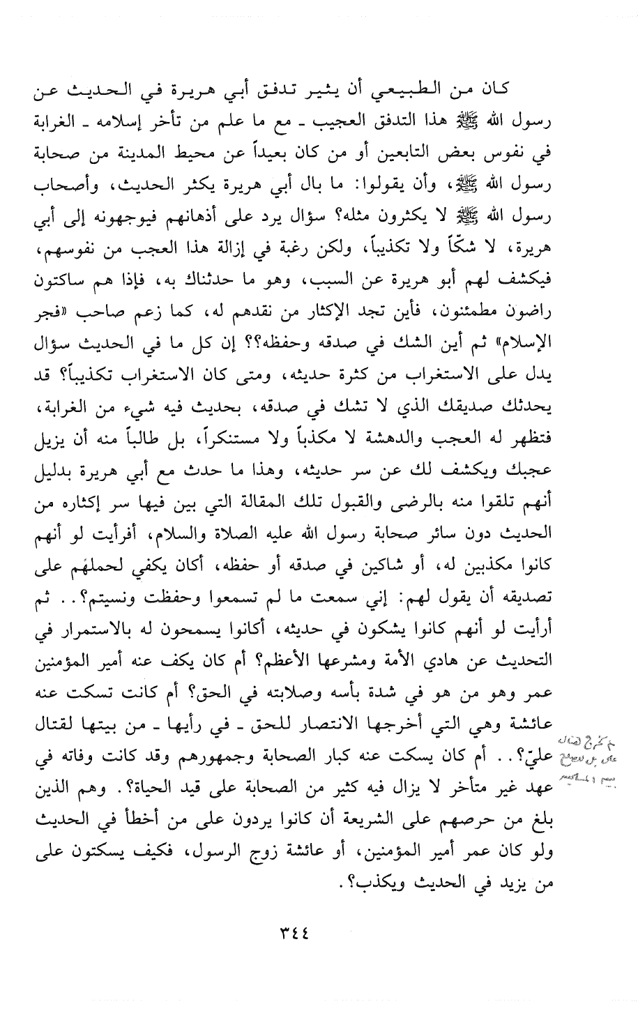 كان من الطبيعي أن يثير تدفق أبي هريرة في الحديث عن رسول الله هذا التدفق العجيب - مع ما عُلِمَ من تأخر إسلامه - الغرابة في نفوس بعض التَّابِعِينَ أو من كان بعيداً عن محيط المدينة من صحابة رسول الله - صَلََّى اللهُ عَلَيْهِ وَسَلَّمَ -، وأن يقولوا: ما بال أبي هريرة يكثر الحديث، وأصحاب رسول الله لا يكثرون مثله؟ سؤال يَرِدُ على أذهانهم فيوجهونه إلى أبي هريرة، لا شَكًّا ولا تكذيبًا ولكن رغبة ً في إزالة هذا العجب من نفوسهم، فيكشف لهم أبو هريرة عن السبب، وهم ما حَدَّثْنَاكَ به، فإذا هم ساكتون راضون مطمئنون، فأين تجد الإكثار من نقدهم له، كما زعم صاحب " فجر الإسلام " ثم أين الشك في صدقه وحفظه؟؟ إِنَّ كل ما في الحديث سؤال يدل على الاستغراب من كثرة حديثه، ومتى كان الاستغراب تكذيباً؟ قد يحدثك صديقك الذي لا تشك في صدقه، بحديث فيه شيء من الغرابة، فتظهر له العجب والدهشة لا مُكَذِّباً ولا مُستنكراً، بل طالباً منه أن يزيل عجبك ويكشف لك عن سر حديثه، وهذا ما حدث مع أبي هريرة بدليل أنهم تلقوا منه بالرضى والقبول تلك المقالة التي بيَّنَ فيها سِرَّ إكثاره من الحديث دُونَ سائر صحابة رسول الله - عَلَيْهِ الصَلاَةُ وَالسَّلاَمُ -، أفرأيت لو أنهم كانوا مُكذِّبِينَ له، أو شَاكِّينَ في صدقه أو حفظه، أكان يكفي لحملهم على تصديقه أن يقول لهم: إني سمعت ما لم تسمعوا وحفظت وَنَسِيتُمْ؟ .. ثم أرأيت لو أنهم كانوا يشكون في حديثه، أكانوا يسمحون له بالاستمرار في التحديث عن هادي الأُمَّةِ ومُشَرِّعِهَا الأعظم؟ أم كان يكف عنه أمير المؤمنين عمر وهو من هو في شدة بأسه وصلابته في الحق؟ أم كانت تسكت عنه عائشة وهي التي أخرجها الانتصار للحق - في رأيها - من بيتها لقتال عَلِيٍّ؟ .. أم كان يسكت عنه كبار الصحابة وجمهورهم وقد كانت وفاته في عهد غير متأخر لا يزال فيه كثير من الصحابة على قيد الحياة؟. وهم الذين بلغ من حرصهم على الشريعة أن كانوا يَرُدُّونَ على من أخطأ في الحديث ولو كان عمر أمير المؤمنين، أو عائشة زوج الرسول، فكيف يسكتون على من يزيد في الحديث ويكذب؟.