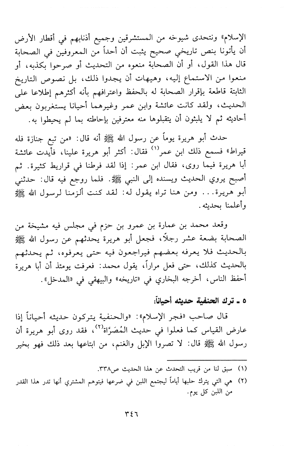 قال صاحب " فجر الإسلام ": «وَالحَنَفِيَّةُ يتركون حديثه أحياناً إذا عارض القياس كما فعلوا في حديث المُصَرَّاةِ (¬2)، فقد روى أبو هريرة أن رسول الله - صَلََّى اللهُ عَلَيْهِ وَسَلَّمَ - قال: «لاَ تُصَرُّوا الإِبِلَ وَالْغَنَمَ، مَنْ ابْتَاعَهَا بَعْدُ ذَلِكَ فَهُوَ بِخَيْرِ