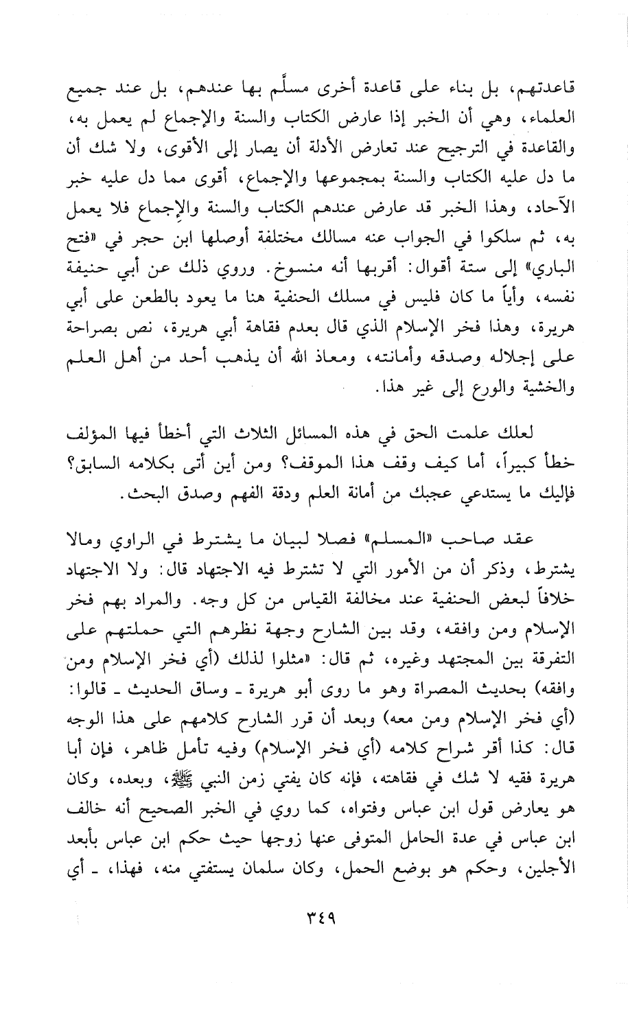 قاعدتهم، بل بناء على قاعدة أخرى مُسَلَّمٌ بِهَا عِنْدَهُمْ، بل عند جميع العلماء وهي أن الخبر إذا عارض الكِتَابَ وَالسُنَّةُ وَالإِجْمَاعَ لَمْ يُعْمَلْ بِهِ، والقاعدة في الترجيح عند تعارض الأدلة أن يصار إلى الأقوى، ولا شك أن ما دَلَّ عليه الكِتَابُ وَالسُنَّةُ بمجموعها والإجماع، أقوى مِمَّا دَلَّ عليه خبر الآحاد، وهذا الخبر قد عارض عندهم الكِتَابَ وَالسُنَّةُ وَالإِجْمَاعَ فلا يُعْمَلُ بِهِ، ثم سلكوا في الجواب عنه مسالك مختلفة أوصلها ابن حجر في " فتح الباري " إلى ستة أقوال: أقربها أنه منسوخ. وروي ذلك عن أبي حنيفة نفسه، وَأَيًّا ما كان فليس في مسلك الحَنَفِيَّةِ هنا ما يعود بالطعن على أبي هريرة، وهذا فخر الإسلام الذي قال بعدم فقاهة أبي هريرة، نَصَّ بصراحة على إجلاله وصدقه وأمانتة، ومعاذ الله أن يذهب أَحَدٌ من أهل العلم والخشية والورع إلى غير هذا.