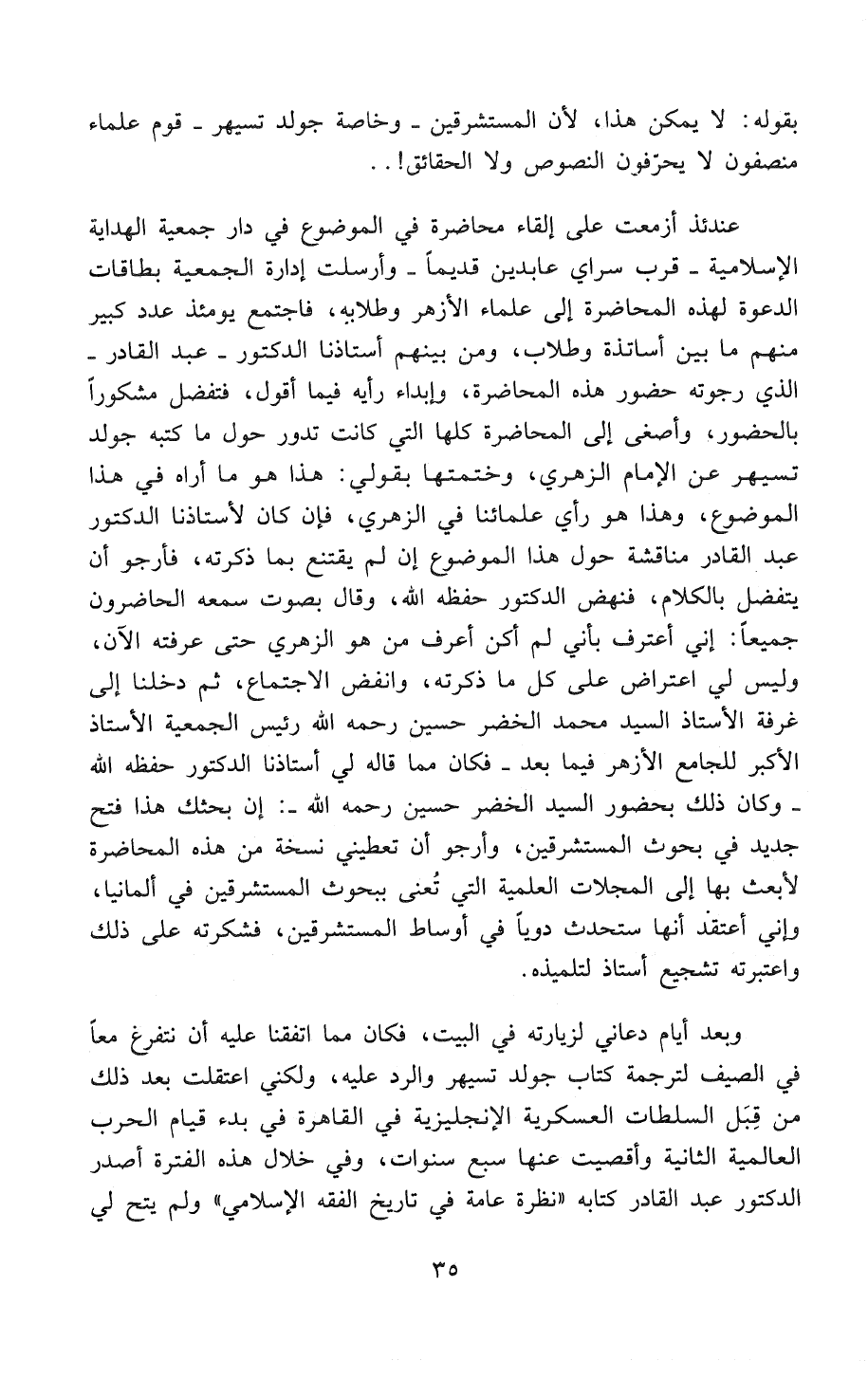 عندئذ أزمعت على إلقاء محاضرة في الموضوع في دار جمعية الهداية الإسلامية - قرب سراي عابدين قَدِيمًا - وأرسلت إدارة الجمعية بطاقات الدعوة لهذه المحاضرة إلى علماء الأزهر وطلابه، فاجتمع يومئذ عدد كبير منهم ما بين أساتذة وطلاب، ومن بينهم أستاذنا الدكتور عبد القادر - الذي رجوته حضور هذه المحاضرة، وإبداء رأيه فيما أقول، فتفضل مشكوراً بالحضور، وأصغى إلى المحاضرة كلها التي كانت تدور حول ما كتبه جولدتسيهر عن الإمام الزُّهْرِيِّ، وختمتها بقولي: هذا هو ما أراه في هذا الموضوع، وهذا هو رأي علمائنا في الزُّهْرِيِّ، فإن كان لأستاذنا الدكتور عبد القادر مناقشة حول الموضوع إن لم يقتنع بما ذكرته، فأرجو أن يتفضل بالكلام، فنهض الدكتور - حَفِظَهُ اللهُ -، وقال بصوت سمعه الحاضرون جميعاً: «إِنِّي أَعْتَرِفُ بِأَنِّي لَمْ أَكُنْ أَعْرِفُ مَنْ هُوَ الزُّهْرِيُّ حَتَّى عَرَفْتُهُ الآنَ، وَلَيْسَ لِي اعْتِرَاضٌ عَلَى كُلِّ مَا ذَكَرْتَهُ»، وَانْفَضَّ الاجتماع، ثم دخلنا غرفة الأستاذ السيد مُحَمَّدٍ الخَضِرْ حُسَيْن - رَحِمَهُ اللهُ - رئيس الجمعية الأستاذ الأكبر للجامع الأزهر فيما بعد - فكان مِمَّا قاله أستاذنا الدكتور - حَفِظَهُ اللهُ -، - وكان ذلك بحضور السيد الخضر حسين - رَحِمَهُ اللهُ -: «إِنَّ بَحْثَكَ هَذَا فَتْحٌ جِدِيدٌ فِي بُحُوثِ المُسْتَشْرِقِينَ، وَأَرْجُو أَنْ تُعْطِينِي نُسْخَةً مِنْ هَذِهِ المُحَاضَرَةِ لأُبْعَثَ بِهَا إِلَى المَجَلاَّتِ العِلْمِيَّةِ التِي تُعْنَى بِبُحُوثِ المُسْتَشْرِقِينَ فِي أَلْمَانْيَا، وَإِنِّي أَعْتَقِدُ أَنَّهَا سَتُحْدِثُ دَوِيًّا فِي أَوْسَاطِ المُسْتَشْرِقِينَ»، فشكرته على ذلك واعتبرته تشجيع أستاذ لتلميذه.