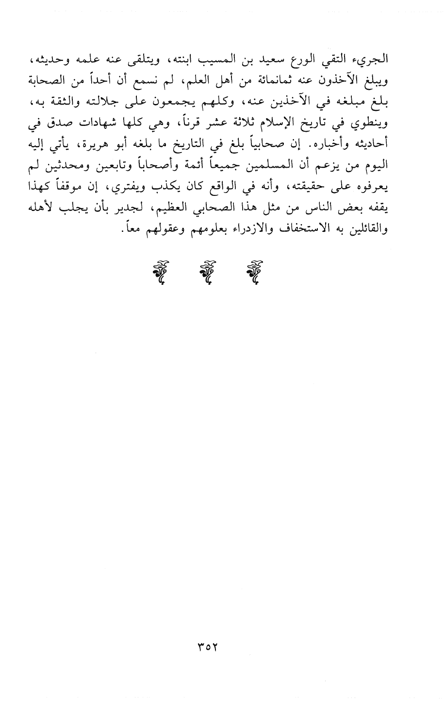 الجريء التقي الورع سعيد بن السيب ابنته، ويتلقى عنه علمه وحديثه، ويبلغ الآخذون عنه ثمانمائة من أهل العلم، لم نسمع أن أحداً من الصحابة بلغ مبلغه في الآخذين عنه، وكلهم يجمعون على جلالته والثقة به، وينطوي في تاريخ الإسلام ثلاثة عشر قَرْنًا، وهي كلها شهادات صدق في أحاديثه وأخباره. إن صحابياً بلغ في التاريخ ما بلغه أبو هريرة، يأتي إليه اليوم من يزعم أن المُسْلِمِينَ جميعاً أئمة وأصحاباً وتابعين وَمُحَدِّثِينَ لم يعرفوه على حقيقته، وأنه في الواقع كان يكذب ويفتري، إن موقفاً كهذا يقفه بعض الناس من مثل هذا الصحابي العظيم، لجدير بأن يجلب لأهله والقائلين به الاستخفاف والازدراء بعلومهم وعقولهم معاً.