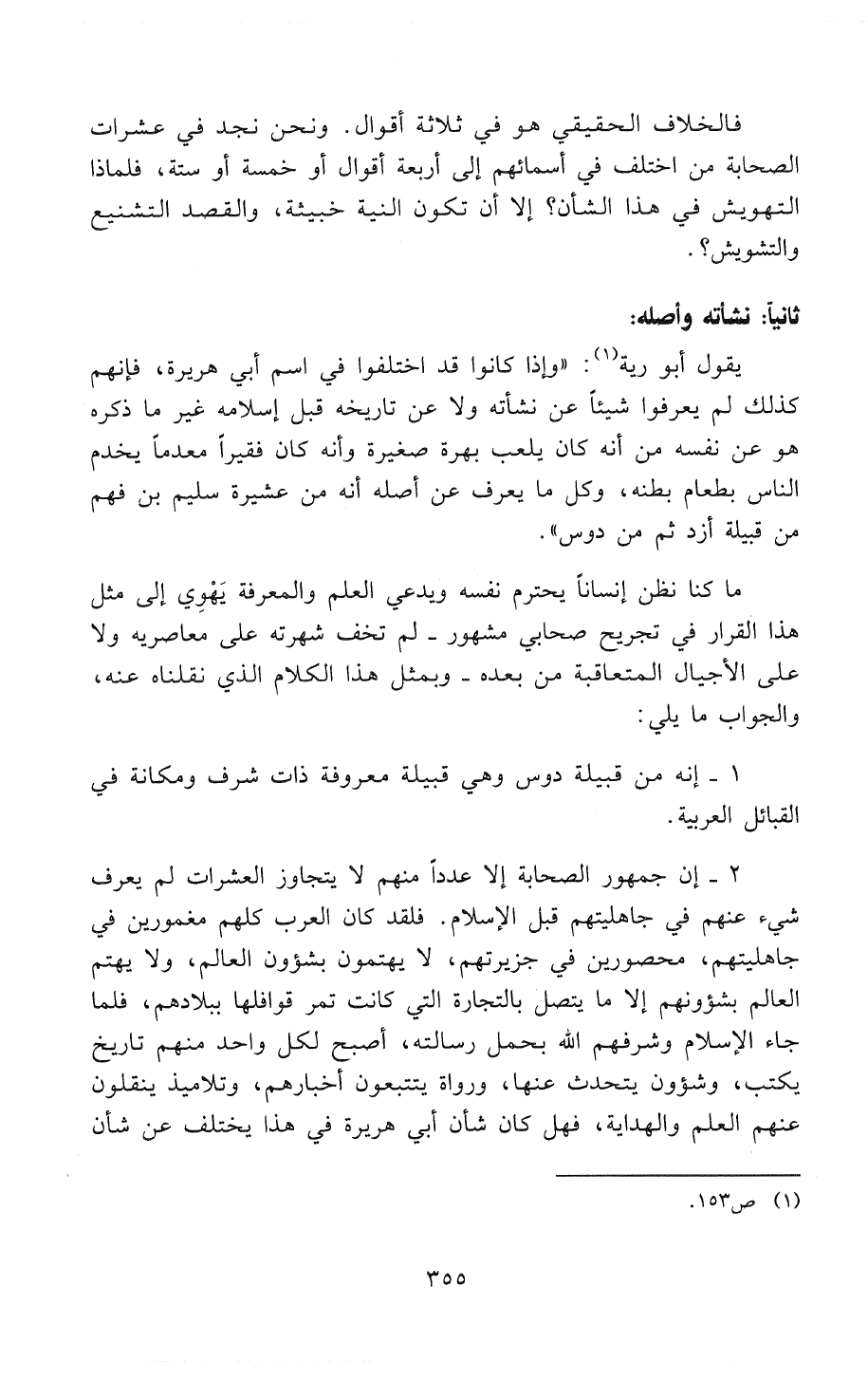 2 - إن جمهور الصحابة إلا عدداً منهم لا يتجاوز العشرات لم يُعْرَفْ شيءٌ عنهم في جاهليتهم قبل الإسلام. فلقد كان العرب كلهم مغمورين في جاهليتهم، محصورين في جزيرتهم، لا يهتمون بشؤون العالم، ولا يهتم العالم بشؤونهم إلا ما يتصل بالتجارة التي كانت تمر قوافلها ببلادهم، فلما جاء الإسلام وشرفهم الله بحمل رسالته أصبح لكل واحد منهم تاريخ يكتب، وشؤون يتحدث عنها، وَرُوَاةٌ يتتبعون أخبارهم، وتلاميذ ينقلون عنهم العلم والهداية، فهل كان شأن أبي هريرة في هذا يختلف عن شأن