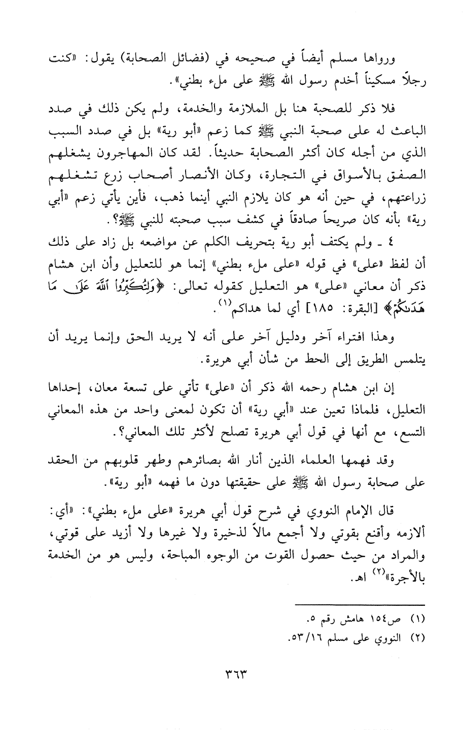 4 - ولم يكتف أَبُو رَيَّةَ بتحريف الكلم عن مواضعه بل زاد على ذلك أن لفظ «عَلَى مِلْءِ بَطْنِي» إنما هو للتعليل وأن ابن هشام ذكر أن معاني «على» هو التعليل كقوله تعالى: {وَلِتُكَبِّرُوا اللَّهَ عَلَى مَا هَدَاكُمْ} أي لما هداكم (¬1).