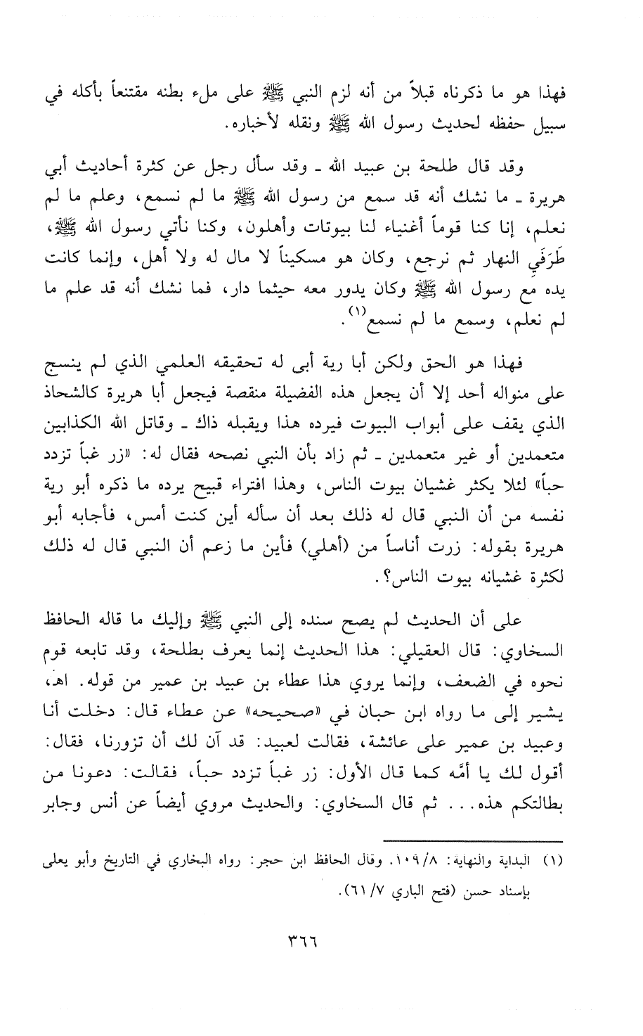 فهذا هو الحق ولكن أَبَا رَيَّةَ أبى له تحقيقه العلمي الذي لم ينسج على منواله أحدٌ إلا أن يجعل هذه الفضيلة منقصة فيجعل أبا هريرة كالشحاذ الذي يقف على أبواب البيوت فيرده هذا ويقبله ذاك - وقاتل الله الكَذَّابِينَ متعمِّدين أو غير متعمِّدين - ثم زاد بأن النَّبِيّنصحه فقال له: «زُرْ غباً تزدَدْ حُبّاً» لئلا يكثر غشيان بيوت الناس، وهذا افتراء قبيح يرده ما ذكره أَبُو رَيَّةَ نفسه من أن النَّبِيَّ قال له ذلك بعد أن سأله أين كنت أمس، فأجابه أبوهريرة بقوله: «زرتُ أناساً من (أهلي)» فأين ما زعم أن النَّبِيَّ قال له ذلك لكثرة غشيانه بيوت الناس؟
