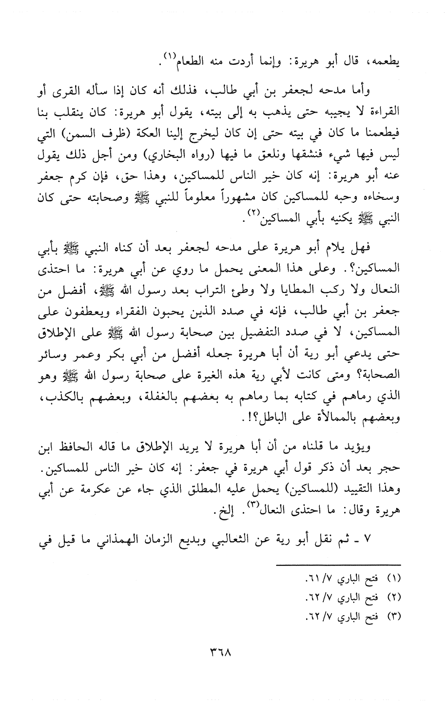 ويؤيد ما قلناه من أن أبا هريرة لا يريد الإطلاق ما قاله الحافظ ابن حجر بعد أن ذكر قول أبي هريرة في جعفر: «إِنَّهُ كَانَ خَيْرَ النَّاسِ لِلْمَسَاكِينِ». وهذا التقييد (للمساكين) يحمل عليه المطلق الذي جاء عن عكرمة عن أبي هريرة وقال: «مَا احْتَذَى النِّعَالَ» (¬3). إلخ