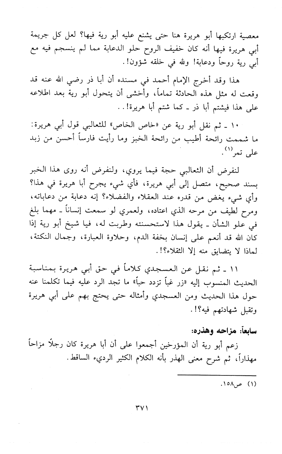 معصية ارتكبها أبو هريرة هنا حتى يشنع عليه أبو رية فيها؟ لعل كل جريمة أبي هريرة فيها أنه كان خفيف الروح حلو الدعابة مما لم ينسجم فيه مع أبي رية روحاً ودعابة! ولله في خلقه شؤون!