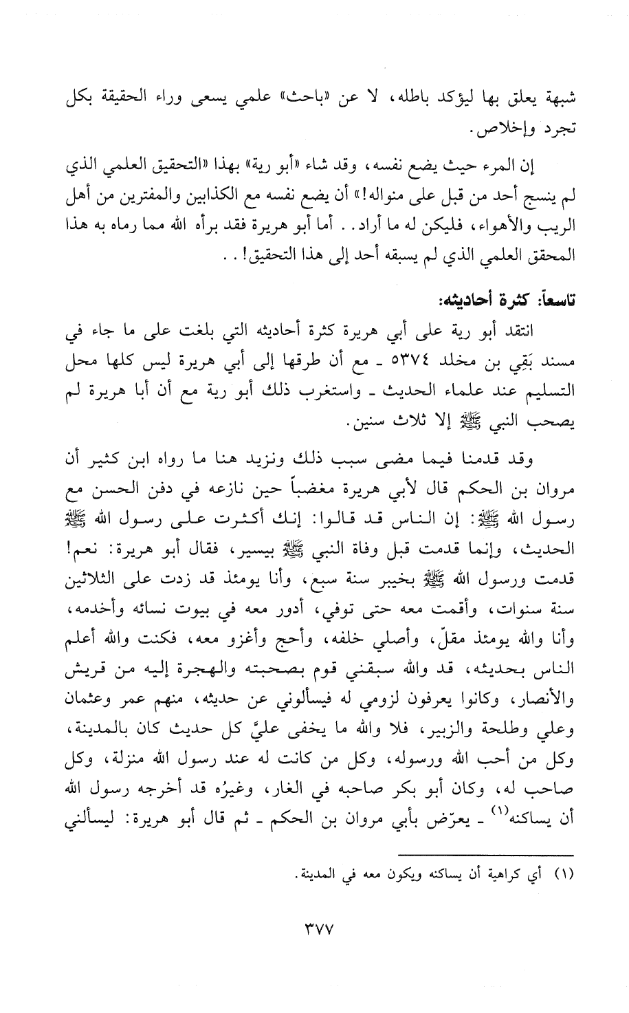 َوقد قدمنا فيما مضى سبب ذلك ونزيد هنا ما رواه ابن كثير أن مروان بن الحكم قال لأبي هريرة مغضباً حين نازعه في دفن الحسن مع رسول الله - صَلََّى اللهُ عَلَيْهِ وَسَلَّمَ -: «إِنَّ النَّاسَ قَدْ قَالُوا إِنَّك أَكْثَرْتَ عَلَى رَسُولِ اللهِ - صَلََّى اللهُ عَلَيْهِ وَسَلَّمَ -» الحديث (*)، " وَإِنَّمَا قَدِمْتَ قَبْلَ وَفَاةِ النَّبيِّ - صَلََّى اللهُ عَلَيْهِ وَسَلَّمَ - بِيَسِيرٍ "، فقال أبوهريرة: " نَعَمْ! قَدِمْتُ وَرَسُولَ اللهِ - صَلََّى اللهُ عَلَيْهِ وَسَلَّمَ - بِخَيْبَرَ سَنَةَ سَبْعٍ، وَأَنَا يَوْمَئِذٍ قَدْ زِدْتُ عَلَى الثَّلاَثِينَ سَنَةً، سَنَوَاتٍ، وَأَقَمْتُ مَعَهُ حَتَّى تُوُفِّيَ، أَدُورُ مَعَهُ فِي بُيُوتِ نِسَائِهِ وَأَخْدِمُهُ، وَأَنَا وَاللهِ يَوْمَئِذٍ مُقِلٌّ، وَأُصَلِّي خَلْفَهُ، وَأَحُجُّ وَأَغْزُو مَعَهُ، فَكُنْتُ وَاللَّهِ أَعْلَمَ النَّاسِ بِحَدِيثِهِ، قَدْ وَاللَّهِ سَبَقَنِي قَوْمٌ بِصُحْبَتِهِ وَالهِجْرَةِ إِلَيْهِ مِنْ قُرَيْشٍ وَالأَنْصَارِ، وَكَانُوا يَعْرِفُونَ لَزَوَمِي لَهُ فَيَسْأَلُونِي عَنْ حَدِيثِهِ، مِنْهُمْ عُمَرُ وَعُثْمَانُ وَعَلِيٌّ وَطَلْحَةُ وَالزُّبَيْرُ، فَلاَ وَاللَّهِ مَا يَخْفَىَ عَلَيَّ كُلُّ حَدِيثٍ كَانَ بِالمَدِيْنَةِ، وَكُلُّ مَنْ أَحَبَّ اللَّهَ وَرَسُولَهُ، وَكُلُّ مَنْ كَانَتْ لَهُ عِنْدَ رَسُولِ اللَّهِ مَنْزِلَةٌ، وَكُلُّ صَاحِبٍ لَهُ، وَكَانَ أَبُو بَكْرٌ صَاحِبَهُ فِي الغَارِ، وَغَيُّرُهُ قَدْ أَخْرَجَهُ رَسُولُ الْلَّهِ أَنْ يُسَاكِنَهُ (¬1) - يُعَرِّضُ بِأَبِي مَرْوَانَ بْنِ الحَكَمِ " - ثُمَّ قَالَ أَبُوْ هُرَيْرَةَ: " لَيَسْأَلْنِيْ