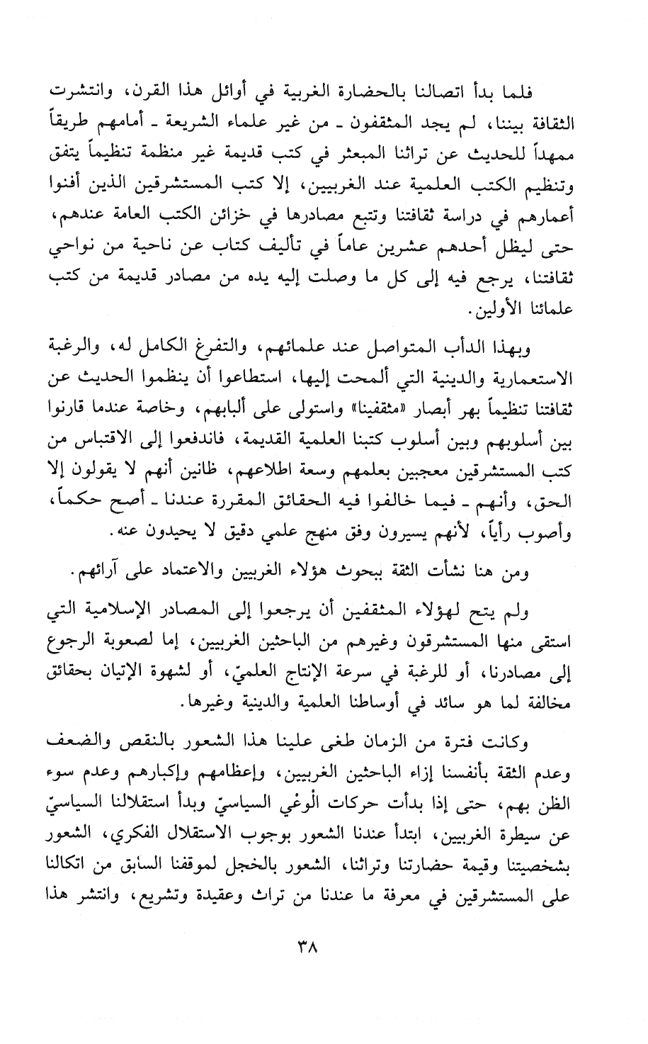 فلما بدأ اتصالنا بالحضارة الغربية في أوائل هذا القرن، وانتشرت الثقافة بيننا، لم يجد المثقفون - من غير علماء الشريعة - أمامهم طريقا مُمَهَّدًا للحديث عن تراثنا المبعثر في كتب قديمة غير منظمة تنظيماً يتفق وتنظيم الكتب العلمية عند الغَرْبِيِّينَ، إلا كُتُبَ المُسْتَشْرِقِينَ الذين أفنوا أعمارهم في دراسة ثقافتنا وتتبع مصادرها في خزائن الكتب العامة عندهم، حتى ليظل أحدهم عِشْرِينَ عَامًا في تأليف كتاب من ناحية من نواحي ثقافتنا، يرجع فيه إلى كل ما وصلت إليه يده من مصادر قديمة من كتب علمائنا الأولين.