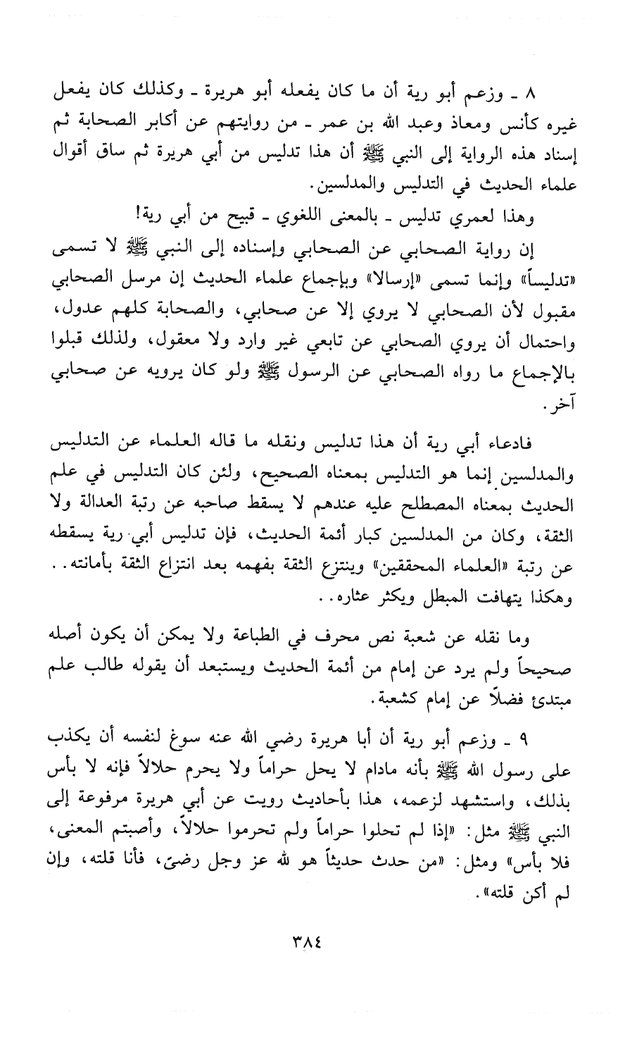 8 - وزعم أَبُو رَيَّةَ أن ما كان يفعله أبو هريرة - وكذلك كان يفعل غيره كأنس ومعاذ وعبد الله بن عمر - من روايتهم عن أكابر الصحابة ثم إسناد هذه الرواية إلى النَّبِيّ - صَلََّى اللهُ عَلَيْهِ وَسَلَّمَ - أن هذا تدليس من أبي هريرة ثم ساق أقوال علماء الحديث في التدليس والمُدَلِّسِينَ.