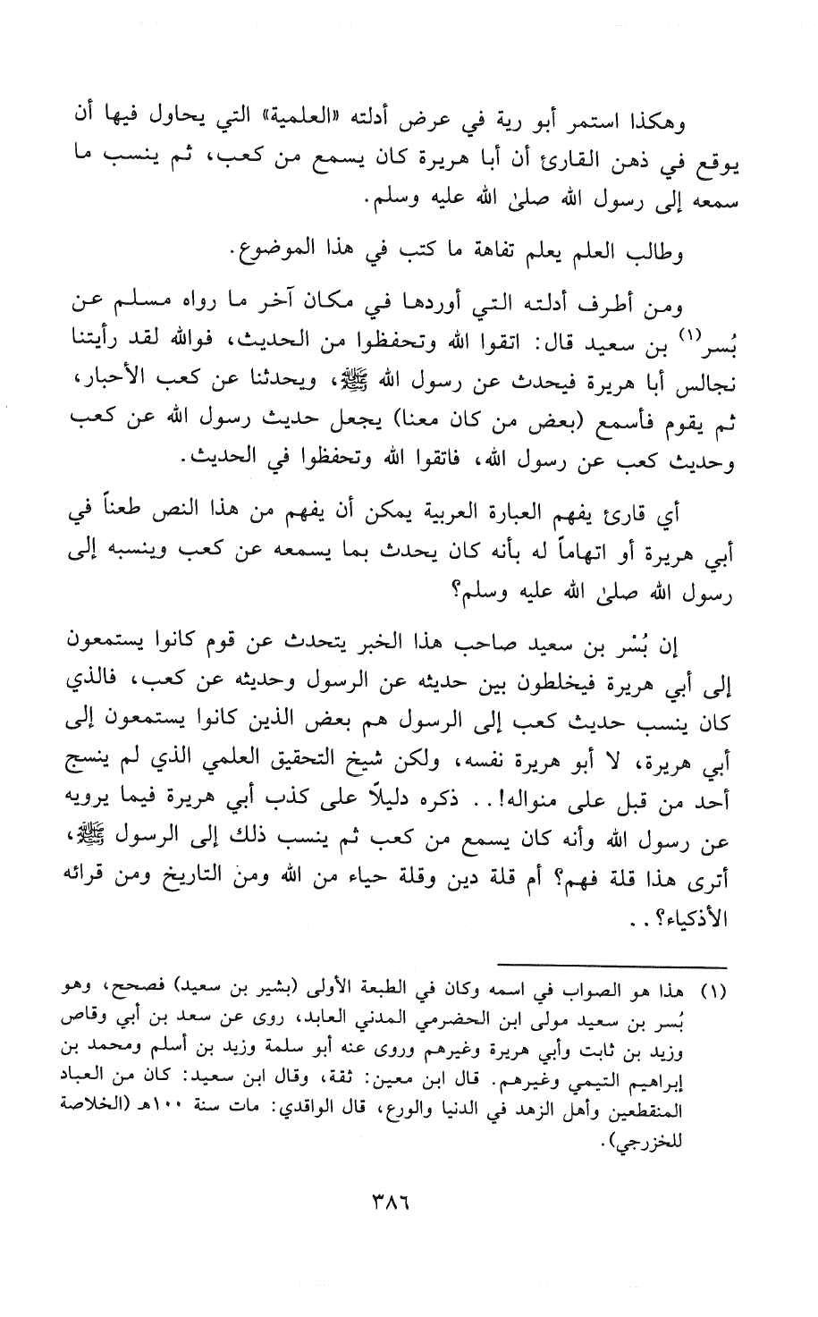 إن بُسْر بن سعيد صاحب هذا الخبر يتحدث عن قوم كانوا يستمعون إلى أبي هريرة فيخلطون بين حديثه عن الرسول وحديثه عن كعب، فالذي كان ينسب حديث كعب إلى الرسول هُمْ بعض الذين كانوا يستمعون إلى أبي هريرة، لا أبو هريرة نفسه ـ ولكن شيخ التحقيق العلمي الذي لم ينسج أحد من قبل على منواله! .. ذكره دليلاً على كذب أبي هريرة فيما يرويه عن رسول الله وأنه كان يسمع من كعب ثم ينسب ذلك إلى الرسول، أترى هذا قلة فهم؟ أم قلة دين وقلة حياء من الله ومن التاريخ ومن قرائه الأذكياء؟