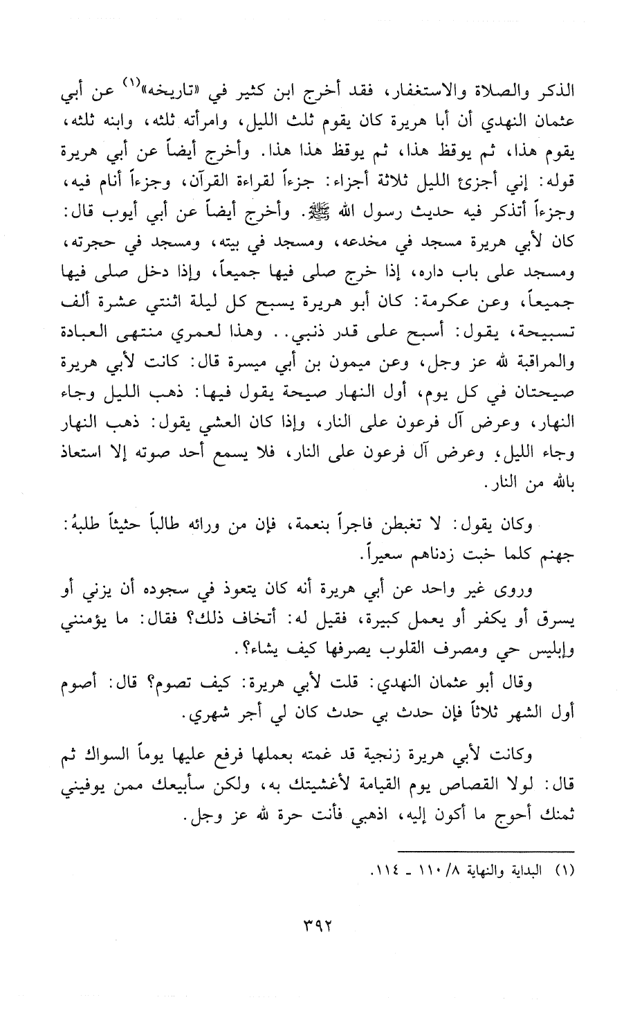 الذكر والصلاة الاستغفار، فقد أخرج ابن كثير في " تاريخه " (¬1) عَنْ أَبِي عُثْمَانَ النَّهْدِيِّ «أَنَّ أَبَا هُرَيْرَةَ كَانَ يَقُومُ ثُلُثَ اللَّيْلِ، وَامْرَأَتُهُ ثُلُثَهُ، وَابْنُهُ ثُلُثَهُ يَقُومُ هَذَا، ثُمَّ يُوقِظُ هَذَا، ثُمَّ يُوقِظُ هَذَا هَذَا». وأخرج أَيْضًا عَنْ أَبِي هُرَيْرَةَ قَوْلَهُ: «إِنِّي أُجَزِّئُ اللَّيْلَ ثَلاَثَةَ أَجْزَاءٍ: فَجُزْءٌ لِقِرَاءَةِ الْقُرْآنِ، وَجُزْءٌ أَنَامُ فِيهِ، وَجُزْءٌ أَتَذَكَّرُ فِيهِ حَدِيثَ رَسُولِ اللَّهِ - صَلََّى اللهُ عَلَيْهِ وَسَلَّمَ -».