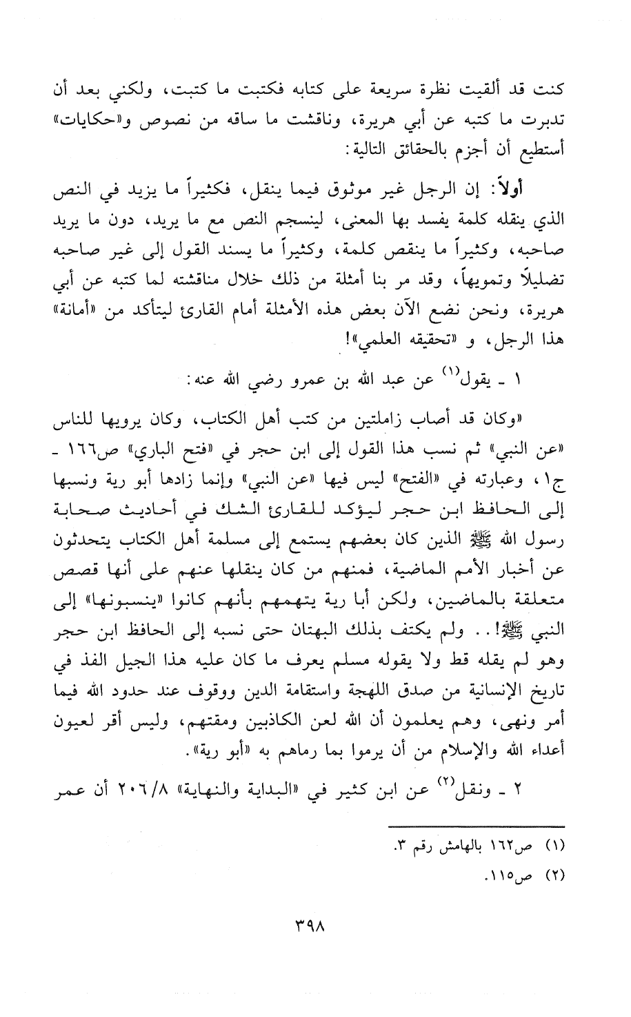 أولاً - إن الرجل غير موثوق فيما ينقل، فكثيراً ما يريد في النص الذي ينقده كلمة يفسد بها المعنى، لينسجم النص مع ما يريد، دُونَ ما يريد صاحبه، وكثيراً ما ينقص كلمة، وكثيراً ما يسند القول إلى غير صاحبه تضليلاً وتمويهاً، وقد مر بنا أمثلة من ذلك خلال مناقشته لما كتبه عن أبي هريرة، ونحن نضع الآن بعض هذه الأمثلة أمام القارىء ليتأكد من «أمانة» هذا الرجل، و «تحقيقه العلمي»!