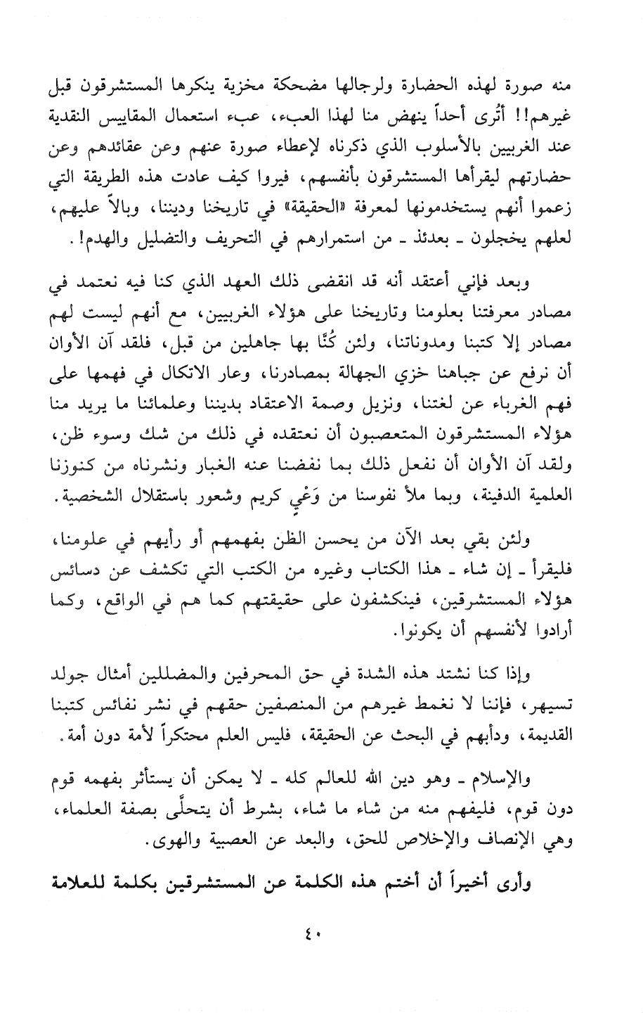 منه صورة لهذه الحضارة ولرجالها مضحكة مخزية ينكرها المُسْتَشْرِقُونَ قبل غيرهم!! أتُرَى أحداً ينهض منا لهذا العِبْءِ، عِبْءَ استعمال المقاييس النقدية عند الغَرْبِيِّينَ بالأسلوب الذي ذكرناه لإعطاء صورة عنهم وعن عقائدهم وعن حضارتهم ليقرأها المُسْتَشْرِقُونَ بأنفسهم، فَيَرَوْا كيف عادت هذه الطريقة التي زعموا أنهم يستخدمونها لمعرفة «الحقيقة» في تاريخنا وديننا، وَبَالاً عليهم، لعلهم يخجلون - بَعْدَئِذٍ -، استمرارهم في التحريف والتضليل والهدم!.