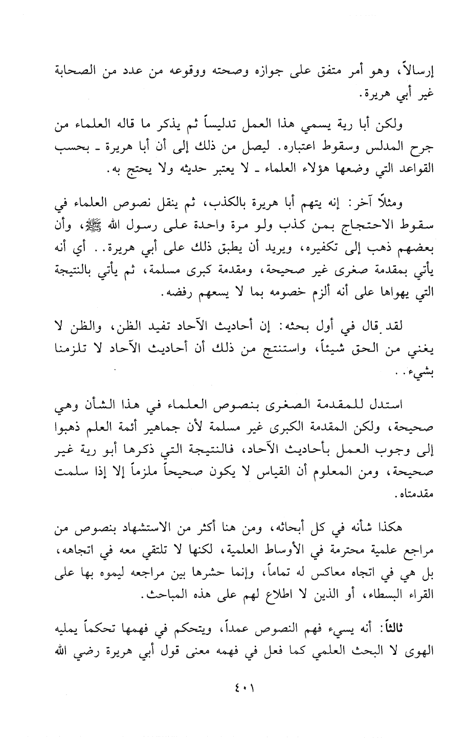 ومثلاً آخر: إنه يتهم أبا هريرة بالكذب، ثم ينقل نصوص العلماء في سقوط الاحتجاج بمن كذب ولو مَرَّةً واحدة على رسول الله - صَلََّى اللهُ عَلَيْهِ وَسَلَّمَ -، وأن بعضهم ذهب إلى تكفيره، ويريد أن يطبق ذلك على أبي هريرة .. أي أنه يأتي بمقدمة صغرى غير صحيحة، ومقدمة كبرى مُسَلَّمَةٍ، ثم يأتي بالنتيجة التي يهواها على أنه ألزم خصومه بما لا يسعهم رفضه.