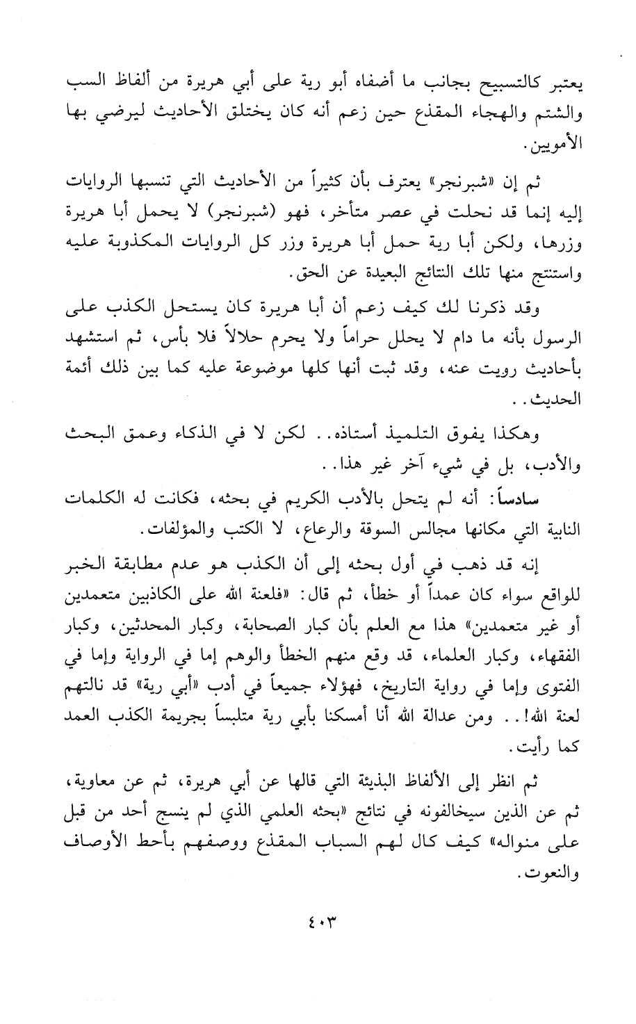 ثم إن «شبرنجر» يعترف بأن كثيراً من الأحاديث التي تنسبها الروايات إليه إنما قد نحلت في عصر متأخر، فهو «شبرنجر» لا يُحَمِّلُ أبا هريرة وِزْرَهَا، ولكن أَبَا رَيَّةَ حَمَّلَ أبا هريرة وِزْرَ كل الروايات المكذوبة عليه واستنتج منها تلك النتائج البعيدة عن الحق.