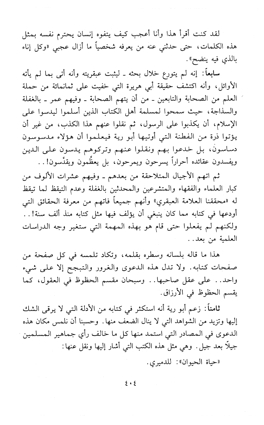 سابعاً - إنه لم يتورع خلال بحثه - ليثبت عبقريته وأنه أتى بما لم يأته الأوائل، وأنه اكتشف حقيقة أبي هريرة التي خفيت على ثمانمائة من حَمَلَةِ العِلْمِ من الصحابة والتَّابِعِينَ - من أن يَتَّهِمَ الصحابة - وفيهم عمر- بالغفلة والسذاجة، حيث سمحوا لِمُسْلِمَةِ أَهْلِ الكِتَابِ الذين أسلموا لِيَدُسُّوا على الإسلام، أَنْ يَكْذِبُوا على الرسول، ثم نقلوا عنهم هذا الكذب، من غير أن يُؤْتُوا ذَرَّةً من الفطنة التي أوتيها أَبُو رَيَّةَ فيعلموا أن هؤلاء مَدْسُوسُونَ دَسَّاسُونَ، بَلْ خُدِعُوا بِهِمْ وَنَقَلُوا عَنْهُمْ وتركوهم يدسون على الدين ويفسدون عقائده أحراراً يسرحون ويمرحون، بل يُعَظَّمُونَ وَيُقَدَّسُونَ! ..