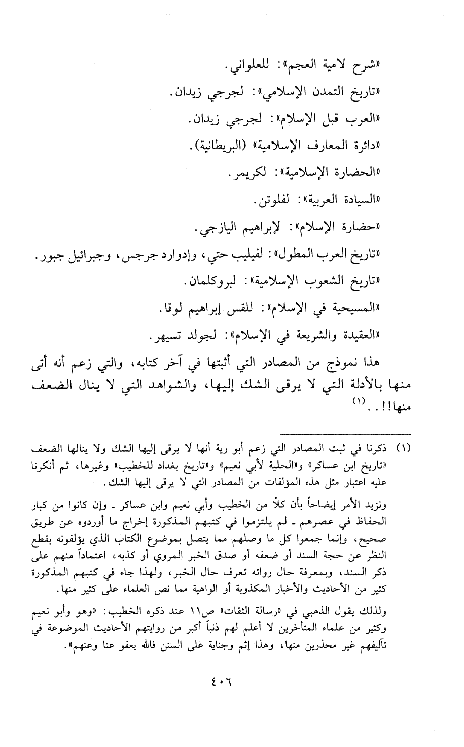هذا نموذج من المصادر التي أثبتها في آخر كتابه، والتي زعم أنه أتى منها بالأدلة التي لا يرقى الشك إليها، والشواهد التي لا ينال الضعف منها!! .. (¬1)