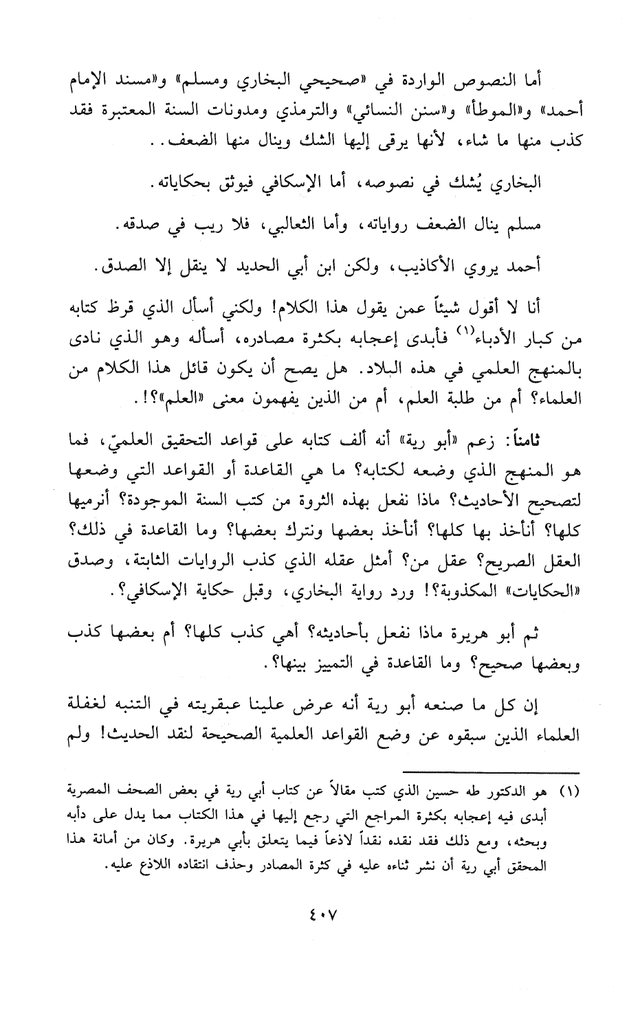 (¬1) هو الدكتور طه حسين الذي كتب مقالاً عن كتاب أَبِي رَيَّةَ في بعض الصحف المصرية أبدى فيه إعجابه بكثرة المراجع التي رجع إليها في هذا الكتاب مِمَّا يدل على دأبه وبحثه: ومع ذلك فقد نقده نقداً لاذعاً فيما يتعلق بأبي هريرة. وكان من أمانة هذا المحقق أَبِي رَيَّةَ أن نشر ثناءه عليه في كثرة المصادر وحذف انتقاده اللاذع عليه.